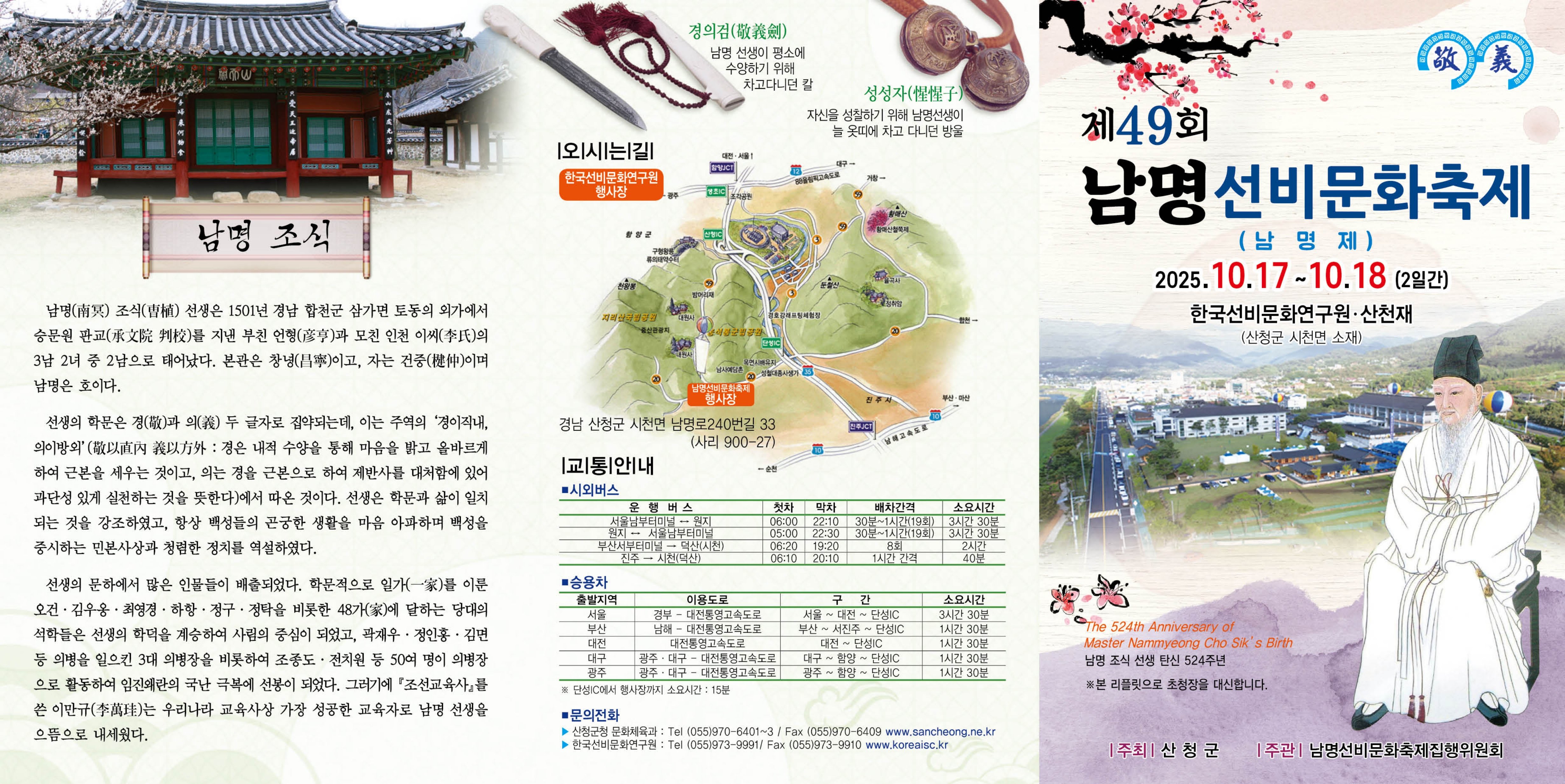 제49회 남명선비문화축제 리플릿 (사진제공=산청군) [PEDIEN] 산청군이 조선 중기 실천유학의 대가인 남명 조식(南冥 曺植) 선생의 '경의(敬義) 정신'을 기리고 그 가치를 현대 사회에 전하기 위해 대규모 축제를 연다. 산청군은 오는 17일부터 18일까지 이틀간 시천면에 위치한 한국선비문화연구원에서 ‘제49회 남명선비문화축제’를 개최한다고 14일 밝혔다.이번 축제는 49회째를 맞이하며, 청렴과 실천을 강조했던 남명 조식 선생의 사상을 되새기는 데 초점을 맞췄다. 축제는 학술적 탐구와 전통 문화 체험이라는 두 가지 축으로 구성되어 방문객들에게 깊이 있는 경험을 제공할 예정이다.축제 첫날인 17일에는 학술행사가 진행된다. ‘선비의 마음공부 정좌(靜坐)2’를 주제로 열리는 이번 행사는 현대인이 선비의 가치와 의미를 깊이 있게 탐구하는 기회를 제공할 전망이다.본격적인 축제가 펼쳐지는 18일에는 남명 묘소 참배와 남명제례가 진행되어 선비정신의 뿌리를 기린다. 이후 개막식을 통해 축제의 의미와 중요성을 대외적으로 알릴 예정이다.이날 축제장에서는 문학적 역량을 겨루는 다양한 경연대회가 열린다. 제27회 전국시조경창대회, 제23회 전국한시백일장, 2025년 경남학생백일장, 제10회 남명휘호대회, 제23회 천상병문학제 등이 동시에 개최되어 축제의 열기를 더한다.특히 남명 조식 선생의 핵심 사상인 청렴, 실천, 배운 사람의 자세 등을 마당극으로 풀어낸 극단 큰들의 ‘남명’ 공연이 축제 분위기를 고조시킬 것으로 기대된다.이와 함께 제27회 산청군서도연합회원전, 남명 관련 사진전시, 지리산국립공원 사진전 등 전시 행사도 마련된다. 방문객들은 국궁, 투호, 윷놀이, 제기차기 등 전통놀이와 가훈쓰기, 족자 체험 등 다채로운 체험 프로그램에도 참여할 수 있다.이승화 산청군수는 이번 축제가 전통문화를 계승하고 발전시키기 위한 뜻깊은 행사임을 강조했다. 이 군수는 “다양한 프로그램을 통해 선비정신의 가치를 직접 느낄 수 있는 이번 축제에 많은 참여를 바란다”고 전했다. -