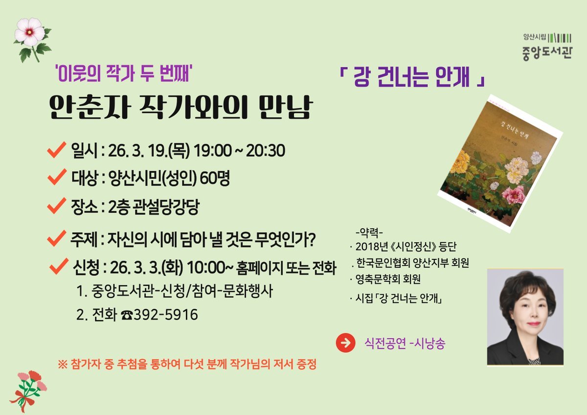 [PEDIEN] 안춘자 작가를 초청해 2층 관설당강당에서 지역 작가와의 만남 행사를 개최한다.2025년 첫 시집 강 건너는 안개 를 펴낸 작가는 경남 합천 출생으로 원동면 화제리에서 텃밭을 가꾸며 글쓰기에 전념하고 있다.어릴 적부터 글쓰기에 펜을 놓지 않고 서툰 걸음으로 출발했지만 시인으로서 야무진 꿈을 펼치고 있는 작가는 2018년 시인정신 으로 등단해 현재 한국문인협회 양산지부, 영축문학회 회원으로 활동 중이다.이번 작가와의 양산 시민이면 누구나 참여할 수 있으며 참가자 혜택으로 추첨을 통해 5명에게 작가의 저서를 증정한다.참가 신청은 현재 도서관 누리집 혹은 전화 접수를 통해 가능하다.선착순 60명까지 모집이며 기타 자세한 사항은 도서관 누리집을 확인하거나 중앙도서관으로 문의하면 된다.