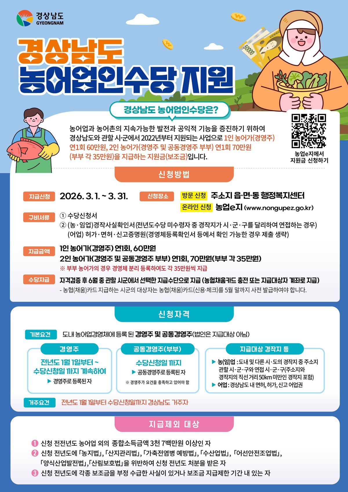 [PEDIEN] 창녕군은 농어업인 공익적 가치 보전과 농가 소득 안정을 위해 3월 1일부터 3월 31일까지'2026년 농어업인수당'신청을 받는다.농어업인수당은 환경보전, 식량 안보, 농촌 유지 등 농어업인이 수행하는 공익적 기능을 보상하기 위한 제도로 2022년 도입 이후 지속적으로 확대돼 왔다.농가 경영 안정을 위한 농어업인수당 대폭 인상 올해는 지급액이 대폭 인상된다.그동안 전국 평균 수준보다 낮았던 지원액을 현실화해, 1인 농어가는 연 60만원, 2인 농어가는 연 70만원으로 상향 지원된다.특히 부부 농어가가 경영체를 분리 등록한 경우에도 각 35만원씩 지급받을 수 있어 농가 단위의 실질적인 지원 효과가 한층 강화될 것으로 기대된다.방문 및 온라인 병행 접수로 신청 편의 확대 신청 대상은 2025년 1월 1일부터 도내 주민등록을 두고 농어업경영체 등록을 유지하면서 실제 농어업에 종사하는 경영주이다.공동경영주는 부부에 한해 인정되며 신청일까지 공동경영주로 등록되어 있어야 한다.신청은 주소지 읍 면 행정복지센터 방문 접수와 온라인 플랫폼 '농업e지'를 통해 가능하다.이를 통해 고령 농업인의 방문 신청 편의를 유지하는 한편 디지털 시스템을 활용한 간편 신청을 병행해 행정 효율성과 접근성을 동시에 높였다.지급은 자격 검증 절차를 거쳐 6월 중 일괄 지급되며 농협 채움카드 포인트로 지급된다.지역경제 선순환 구조 구축 기대 농어업인수당은 단순한 현금 지원을 넘어 지역 내 소비를 촉진하고 소상공인 매출 증대에 기여하는 지역경제 활성화 정책으로 평가받고 있다.군은 총사업비 64억원이 투입되는 이번 사업이 농가 경영 부담을 완화하는 동시에 농어촌 지역 내 소비 확대를 통해 지역경제 선순환 구조 형성에 기여할 것으로 기대하고 있다.군은 신청 기간 동안 적극적인 홍보와 안내를 통해 대상자가 빠짐없이 신청할 수 있도록 지원할 계획이다.군 관계자는"농어업은 우리 군의 근간이자 지역 공동체를 지탱하는 소중한 기반"이라며"농어업인수당 인상을 통해 농가의 실질 소득을 보전하고 지속 가능한 환경 조성에 최선을 다하겠다"고 말했다.