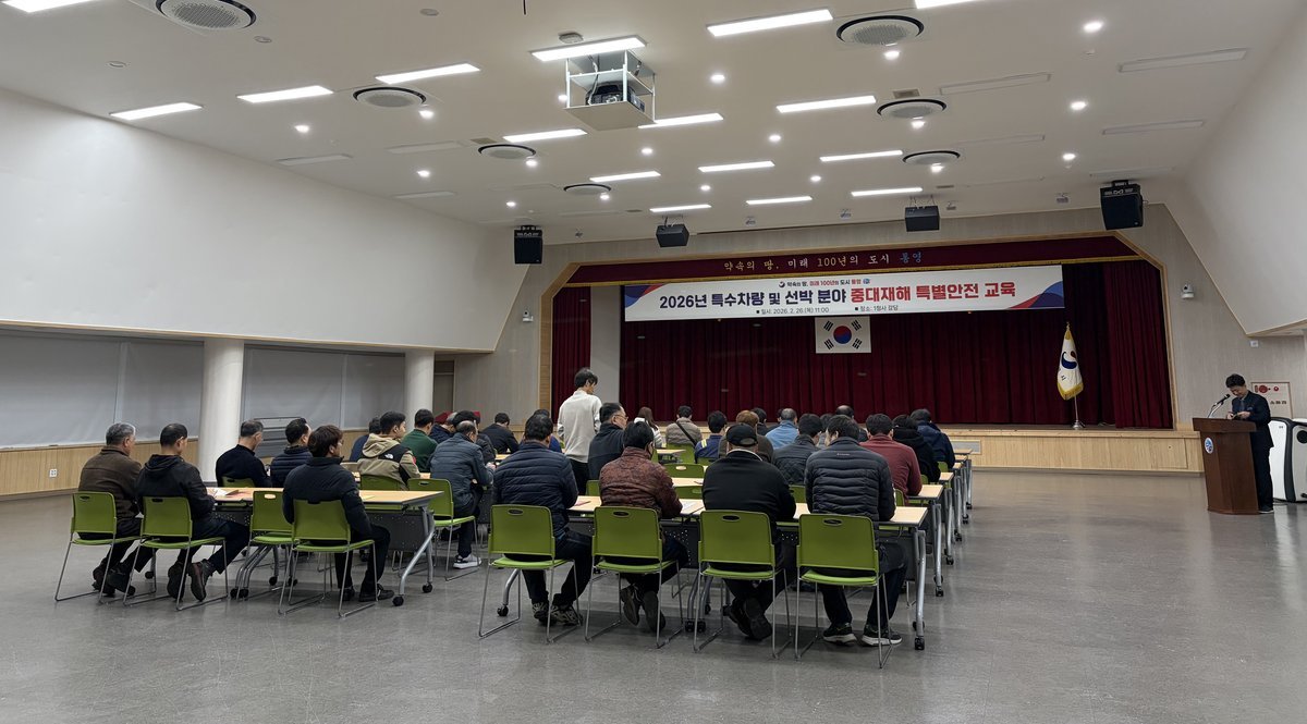 [PEDIEN] 통영시는 지난달 26일 시청 강당에서 ‘2026년 특수차량 및 선박 분야 중대재해 특별 안전 교육’을 실시했다.이번 교육은 최근 중대재해 안전사고에 대한 사회적 경각심이 높아짐에 따라 공무원 및 공무직 근로자들의 안전의식을 근본적으로 혁신하고 중대재해 발생 요인을 선제적으로 차단하기 위해 마련됐다.이날 교육에는 사고 발생 시 대형 재해로 이어질 가능성이 큰 특수차량 및 선박 분야 종사자들을 대상으로 현장 인력과 관련 공무원 50여명이 참여했다.교육은 현장감 있는 내용을 바탕으로 중대재해처벌법의 이해 최근 중대재해 사고사례 전파 ‘불안전한 행동행동에 따른 재해 예방대책 산업보건 및 직업병 예방, 유해 위험 작업환경 관리에 관한 사항 등으로 진행됐다.김진환 시민안전과장은“특수차량과 선박은 사고 발생 시 대형 참사로 이어질 가능성이 큰 만큼, 종사자들의 철저한 안전 수칙 준수가 무엇보다 중요하다”며“중대재해 없는 안전한 통영 건설을 위해 최선을 다하겠다”고 밝혔다.한편 통영시는 올해 중대재해 예방을 위해 관내 중소사업장에 대한 현장점검 및 교육, 전문가 컨설팅을 지속적으로 추진해 중대재해 예방 사각지대를 해소해 나갈 방침이다.