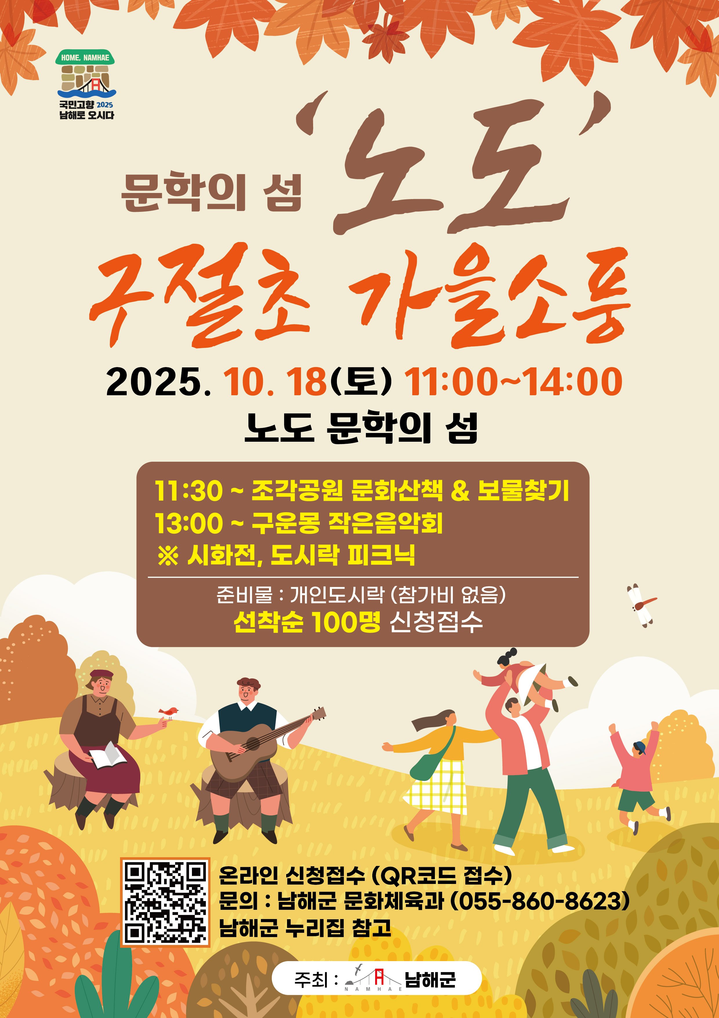 2. ‘노도 구절초 가을소풍’개최 (사진제공=남해군) [PEDIEN] 남해군은 오는 10월 18일 토요일 오전 11시부터 오후 2시까지 문학의 섬 ‘노도’ 일원에서 ‘노도 구절초 가을소풍’ 행사를 개최한다. 이번 행사는 구절초가 만개하는 가을을 맞아 문학인과 섬 주민, 방문객이 함께 어울려 문학과 음악, 자연을 만끽할 수 있도록 마련됐다. 이번 소풍은 ‘문학- 가을- 구절초’를 핵심 콘셉트로 삼았다. 참가자들은 김만중의 유배지이자 의 배경으로 알려진 노도의 아름다운 풍경 속에서 여유로운 시간을 보낼 수 있을 전망이다. 주요 프로그램으로는 오전 11시 30분부터 시작되는 ‘조각공원 문화산책 & 보물찾기’가 있다. 오후 1시에는 다양한 장르의 공연이 펼쳐지는 ‘구운몽 작은음악회’가 진행되며, 대중가요, 클래식, 통기타 연주 등 다채로운 무대가 선보여질 예정이다. 또한 노도 곳곳에서는 지역 문인들의 작품을 전시한 시화전이 열려 문학적 감성을 더한다. 행사는 도시락 피크닉 형태로 진행되며, 참가자들은 개인 도시락을 준비해야 하지만 별도의 참가비는 없다. 참가 신청은 선착순 100명을 대상으로 포스터 내 QR코드를 통해 온라인으로 접수 가능하다. 남해군 문화체육과 관계자는 “문학과 자연, 음악이 어우러진 소박하지만 특별한 축제”라며 “많은 군민과 관광객이 함께해 가을의 낭만을 즐기기를 기대한다”고 밝혔다. -