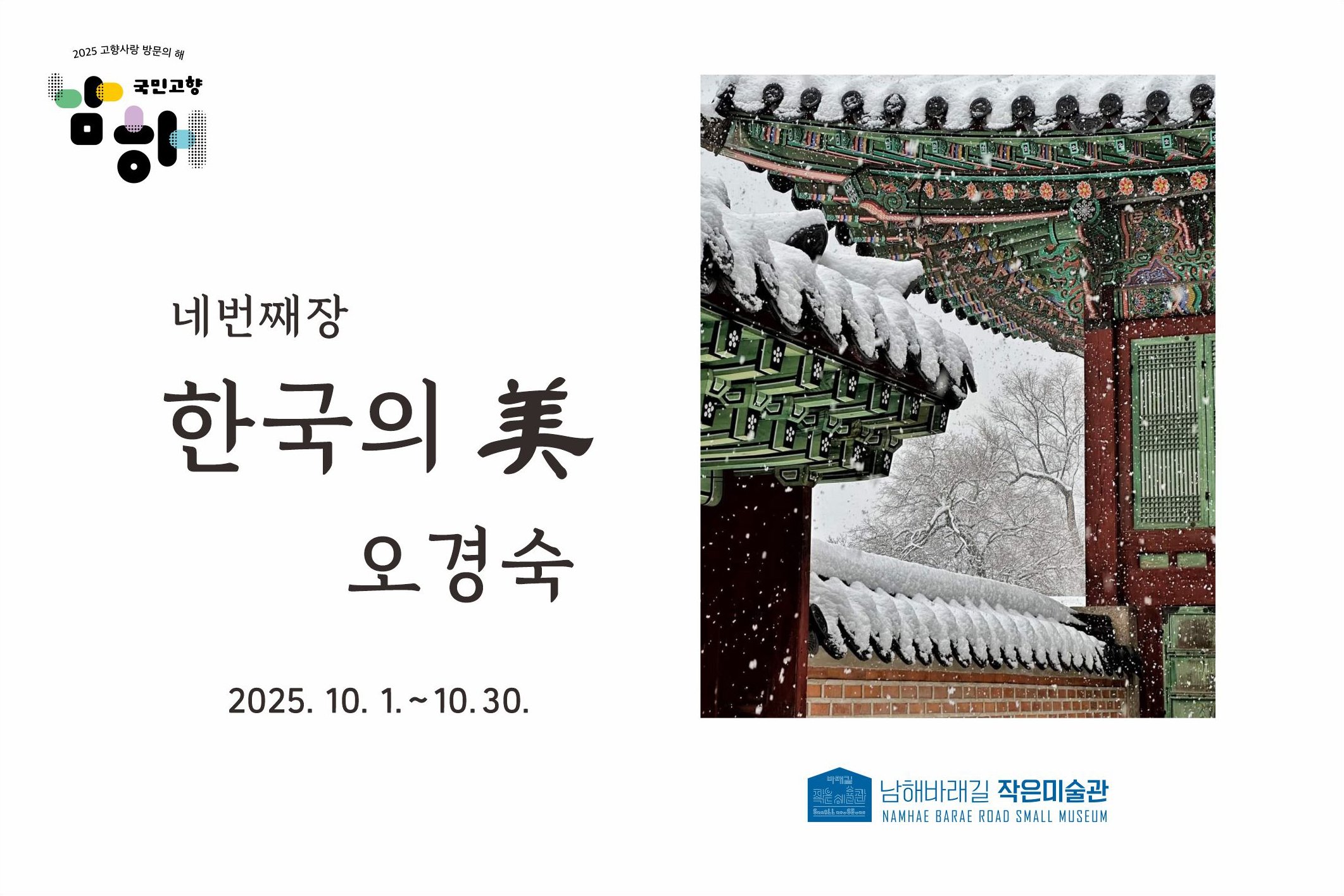 8. 바래길작은미술관 10월 전시, 오경숙 개인전 (사진제공=남해군) [PEDIEN] 교육공무원 생활을 마친 후 남해에 정착해 화가로서 제2의 인생을 시작한 오경숙 작가가 남해의 아름다운 풍경과 추억을 담은 네 번째 개인전을 열었다. 이번 전시는 남해군 바래길작은미술관에서 이달 30일(화)까지 진행되며, 작가의 예술적 여정과 깊은 공감을 나누는 장이 될 전망이다. 오경숙 작가의 개인전 에서는 남해의 정취가 물씬 풍기는 수채화 작품 30여 점을 만날 수 있다. 작가는 풍요로운 가을을 맞아 남해의 자연과 일상 속 정물을 섬세한 붓 터치로 화폭에 옮겼다. 특히 오 작가의 이력은 주목할 만하다. 그는 교육 현장을 떠난 후 남해문화원 서양화반 수강을 계기로 본격적인 미술 활동에 입문한 늦깎이 화가다. 미술의 길에 들어선 이후 오 작가는 2023년부터 활발하게 활동하며 미술가로서의 입지를 다졌다. 제72회 개천예술제, 대한민국회화대전, 한일 교류전인 삭일회 등 권위 있는 단체전에 연이어 참여하며 실력을 인정받았다. 오경숙 작가는 “미술관을 찾는 관람객들과 작품을 통해 깊은 공감과 추억을 나눌 수 있기를 기대한다”고 전시 개최 소감을 밝혔다. -