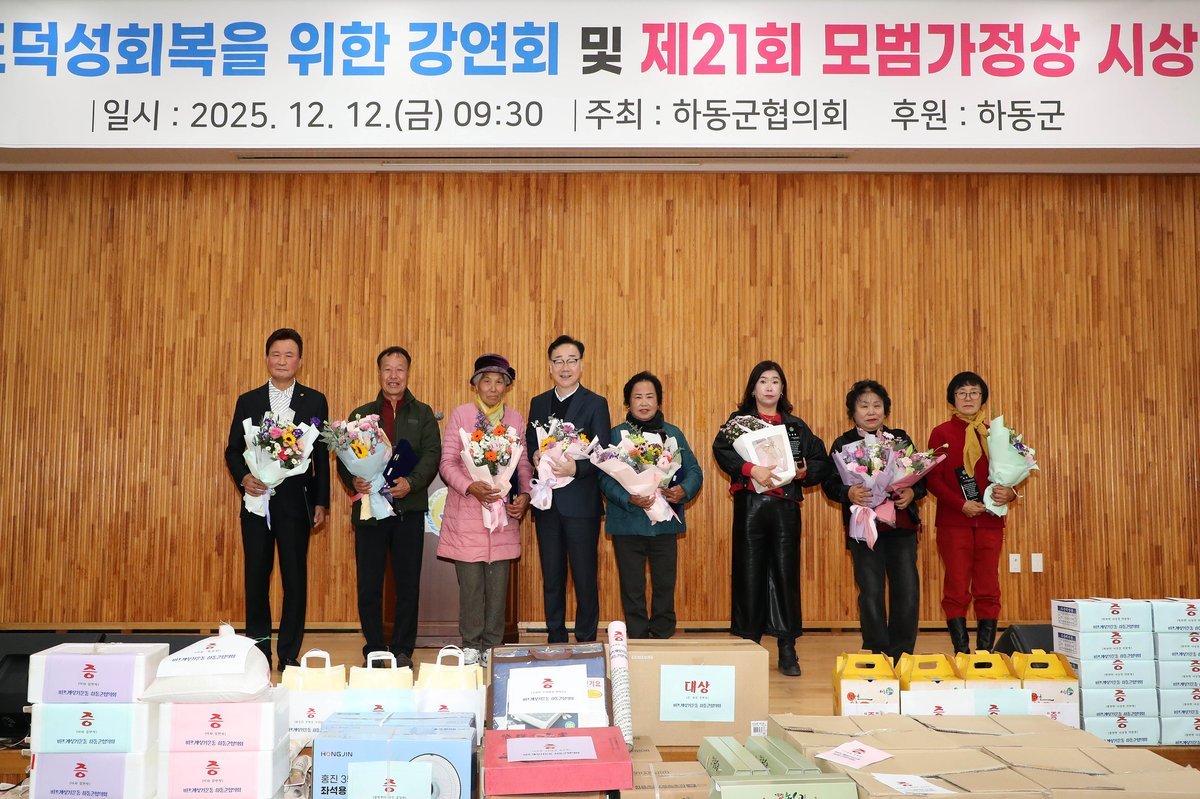 바르게살기운동 하동군협의회, 제21회 모범가정상 시상 (하동군 제공) [PEDIEN] 바르게살기운동 하동군협의회는 지난 12일 양보문화센터에서 ‘2025년 도덕성 회복 강연회 및 제21회 모범가정상 시상식’행사를 열었다.이날 행사에는 하승철 군수를 비롯해 김구연 도의원, 바르게살기 하동군협의회 임원 및 읍·면 위원회 위원장 등 130여 명이 참석했다.행사는 영신대학교 김대규 교수님의 도덕성 회복 운동 강의에 이어 국민의례, 행동강령 낭독, 유공회원 표창 및 모범가정상 시상 순으로 진행됐다.모범가정상은 사회 기초단위인 가정의 중요성이 강조되는 시점에서 ‘바르게 사는 모범가정’을 발굴함으로써 건강한 사회 분위기 조성에 기여하고자 매년 시상하고 있다.이날 모범가정상에는 하동읍 김경란 씨 외 12명에게 바르게살기 하동군협의회장 표창장이 수여됐다.유공회원 표창은 △군협의회 김태환 부회장이 행정안전부 장관 표창 △진교면 김병규·양보면 박점이·청암면 조순금 회원이 경상남도지사 표창 △횡천면 김영순 사무장이 도의회의장상 △금성면 서기순 회원이 중앙협의회장 표창 △금남면 김성애·하동읍 김춘화 회원이 도협의회장 표창 △군협의회 이정석 부회장이 바르게 금장을 각각 수상했다.군 기관단체상으로는 △군협의회 유명숙 부회장·양보면 오순녀 위원장·고전면 정금옥 부위원장이 하동군수 표창 △옥종면 박영희 부위원장·하동읍 김경란 회원·악양면 정덕순 회원이 하동군의회 의장 표창 △군협의회 김헌석 이사가 국회의원 표창 △청암면 노숙이 회원이 농협 표창장 △금성면 문경순 회원이 산림조합 표창장 △금성면 김옥자 회원이 신협 표창장을 수상했다.마지막으로 △금성면위원회가 최우수 위원회 △진교면위원회가 우수 위원회 △하동읍위원회가 최다참석위원회 △진교면 이유호 위원장이 최우수위원장으로 군협의회장 표창장을 수상했다.강찬호 협의회장은 “지난 1년간 바르게살기 운동 실천을 통해 물심양면으로 노력한 회원들께 진심으로 감사드린다”며, “2026년에도 가족 사랑과 이웃사랑을 몸소 실천하여 건강한 지역사회를 만드는 데 앞장서겠다”라고 말했다. -