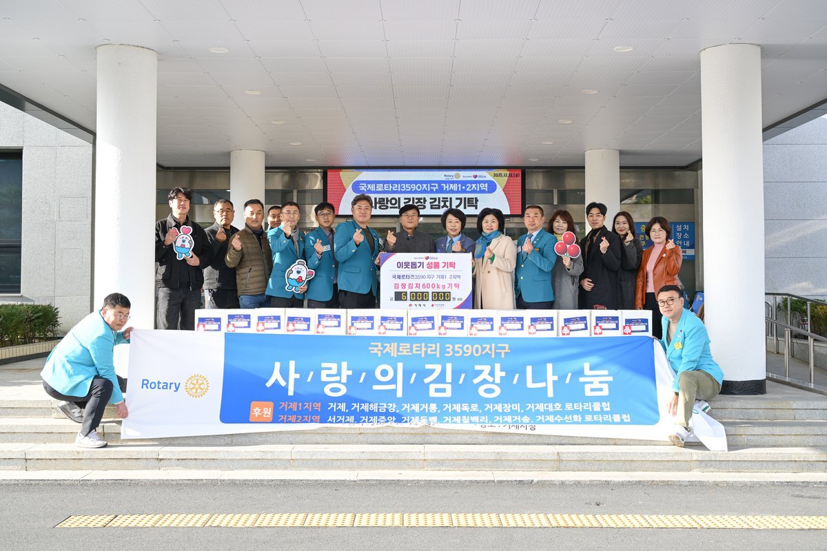 국제로타리3590지구 거제 1·2지역,이웃돕기 김장김치 650kg 기탁 (거제시 제공) [PEDIEN] 국제로타리3590지구 거제1·2지역이 지역 내 어려운 이웃을 위한 따뜻한 나눔을 실천했다.12일, 거제1·2지역 로타리 클럽은 관내 저소득층을 위해 600만원 상당의 김치 130박스를 거제시에 전달했다.이번에 기탁된 김치는 거제1·2지역 12개 클럽 회원들이 직접 재배한 배추로 만들어졌다. 로타리 봉사단은 김장 행사를 통해 정성껏 김치를 담갔다.정성으로 만들어진 김치는 관내 사회복지시설과 6개 면·동의 저소득 세대에 전달될 예정이다.윤원택·고정이 대표는 나눔에 동참할 수 있어 기쁘다는 소감을 밝혔다. 또한, 정성껏 준비한 김치가 추운 겨울을 나는 이웃들에게 작은 위로와 힘이 되기를 바란다며 앞으로도 지역사회와 함께하는 나눔 활동에 지속적으로 협력할 것을 약속했다.변광용 거제시장은 국제로타리의 따뜻한 마음에 감사를 표하며, 거제시 또한 소외계층 지원과 나눔 문화 확산을 위해 더욱 노력하겠다고 밝혔다.
