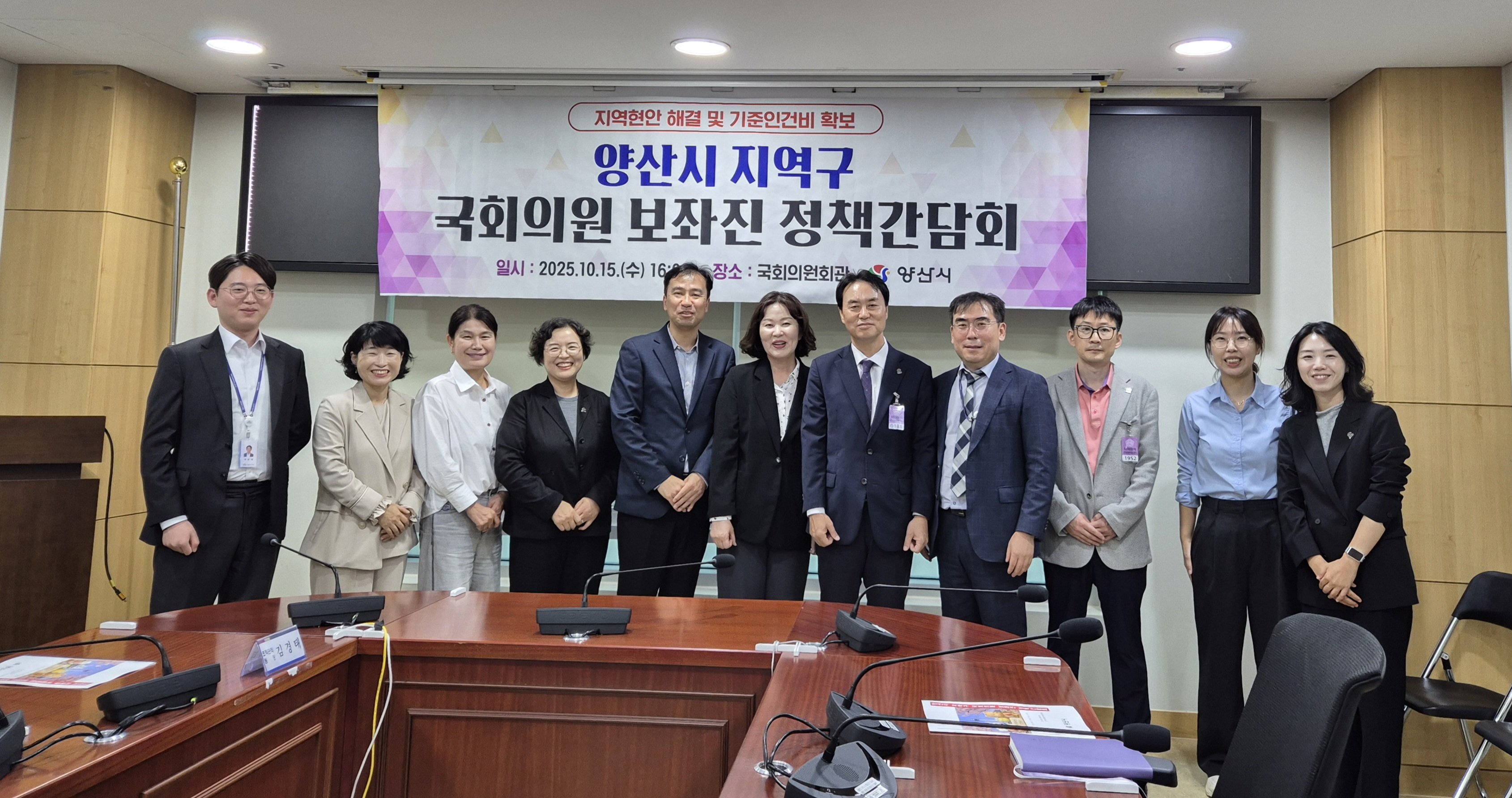 국회의원 보좌진 정책간담회 (사진제공=경상남도) [PEDIEN] 양산시가 지역구 국회의원 보좌진과 정책 간담회를 열고 시정 주요 현안 해결을 위한 국회 차원의 적극적인 지원을 요청했다.이번 간담회는 시의 고질적인 인력난 해소와 미래 성장 동력 확보를 위한 국비 지원을 목표로, 지난 15일 여의도 국회 의원회관에서 양산시 관계 공무원 8명과 지역구 국회의원실 보좌진 12명이 참석한 가운데 진행됐다.양산시는 먼저 지방행정 수요가 급증하고 있음에도 정부의 기준인건비가 이를 충분히 반영하지 못해 자치단체 역할 수행에 한계가 있음을 지적했다.이에 따라 합리적인 기준인건비 제도 개선과 국가 정책 수행에 필요한 기준인력 증원 등 국회의 적극적인 관심과 협조를 요청하며 인력 확보에 총력을 기울였다.미래 먹거리 확보를 위한 국비 지원 건의도 이어졌다. 시는 양산부산대병원의 교육·의료·연구 인프라와 연계하여 첨단의료기기 분야에 특화된 ‘바이오메디컬 AI 이노베이션센터’ 구축을 위한 국비 지원을 건의했다.이 센터는 기업-병원-연구기관이 집적화된 종합지원 거점 역할을 수행하며 양산의 첨단 의료 산업을 이끌 것으로 기대된다.이와 함께 양산시는 자매결연 도시인 포르투갈 신트라시의 지방정세 변화에 따른 교류 관계 강화를 위해 국회 차원의 적극적인 관심과 협조를 요청했다.앞서 나동연 양산시장은 지난달 행정안전부 등 중앙부처를 직접 방문해 기준인건비 확보와 국비 사업 건의를 진행한 바 있으며, 이번 보좌진과의 간담회는 중앙정부 설득을 위한 후속 조치로 풀이된다.간담회에 참석한 국회의원실 보좌진은 “지방 현장의 목소리를 직접 들을 수 있는 뜻깊은 자리였다”며 “시의 건의사항이 제도 개선으로 이어질 수 있도록 국회와 중앙부처에 적극적으로 전달하겠다”고 밝혔다.양산시는 이번 간담회를 계기로 지역 현안 해결을 위한 국회 및 중앙정부와의 협력 기반을 한층 강화하고 소통을 지속적으로 확대해 나갈 계획이다. -