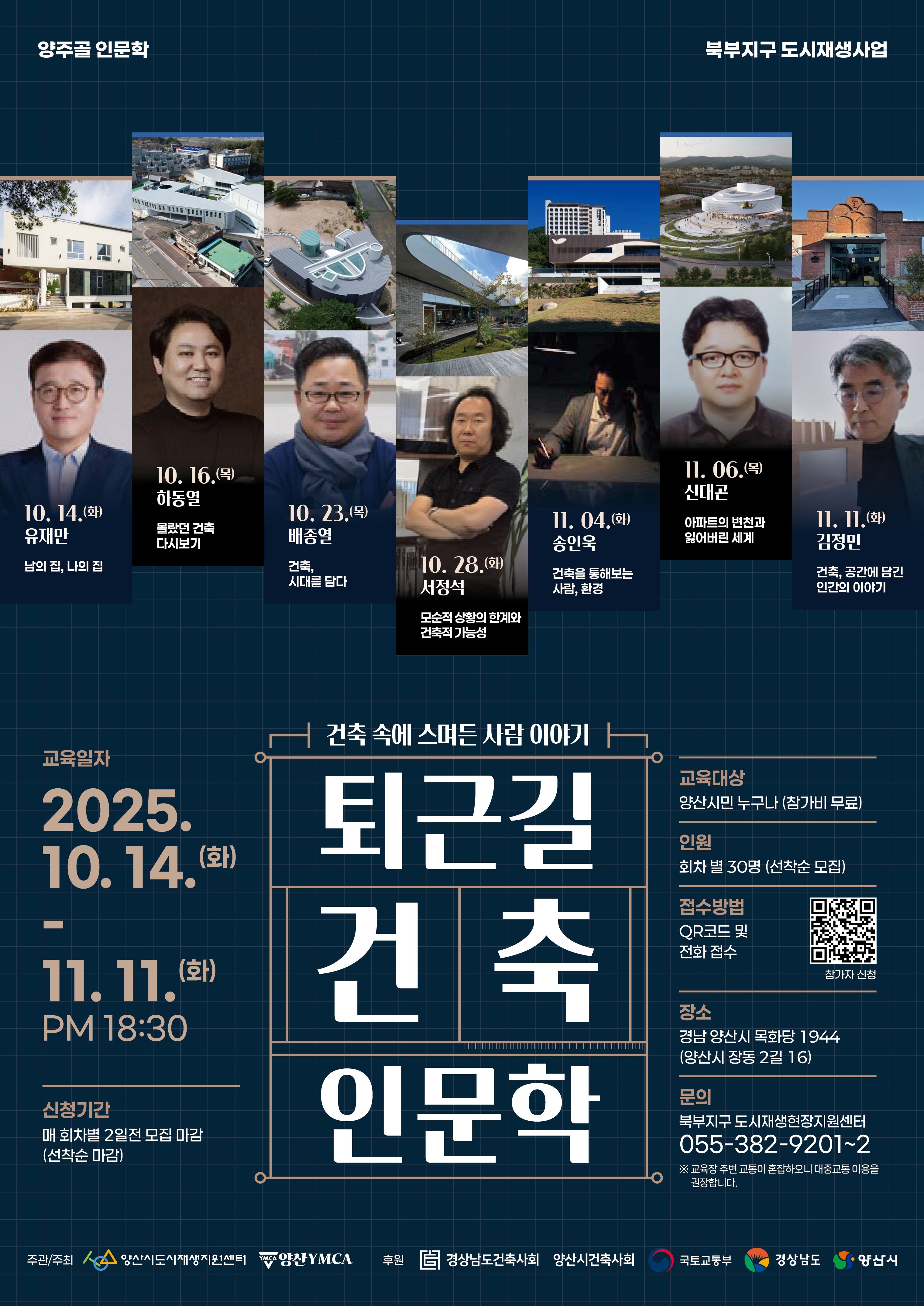 양주골 퇴근길 건축 인문학 포스터 (사진제공=양산시) [PEDIEN] 양산시 북부지구 도시재생 거점시설이 단순한 공간을 넘어 시민들의 지적 교류와 문화 향유의 장으로 거듭나고 있다. 양산시는 최근 ‘양주골 퇴근길 건축 인문학’ 프로그램을 성공적으로 시작하며 건축물을 인문학적 시각에서 재해석하는 새로운 시도를 선보였다.이번 행사는 북부지구 도시재생현장지원센터와 양산YMCA가 주관하고 경상남도 및 양산시 건축사회가 후원했다. 특히 강연 장소인 목화당 1944(마을카페)는 도시재생 사업의 핵심 거점시설로, 시민들이 일상 속에서 건축과 공간의 가치를 새로운 문화자산으로 인식하도록 기획됐다.지난 14일 열린 1회차 강연은 ‘남의 집 / 나의 집’이라는 흥미로운 주제로 진행됐다. 경상남도 공공건축가인 유재만 건축가와 허정도 전 경상남도 총괄건축가가 연사로 나서 집에 담긴 다양한 인문학적 의미를 심도 있게 풀어냈다.퇴근 시간 이후에 진행됐음에도 불구하고 참석자들은 강연에 큰 호응을 보였다. 특히 강연 후 이어진 질의응답 시간에는 건축에 대한 시민들의 뜨거운 관심이 깊이 있는 질문으로 이어지며 현장의 열기를 더했다.양산시 관계자는 이번 행사가 지역 기관들의 협력을 통해 도시재생 거점시설이 주민들의 문화 향유와 소통을 위한 장으로 자리 잡았음을 확인한 의미 있는 시간이었다고 평가했다. 시는 오는 11월 11일까지 매주 화요일과 목요일 저녁 6시 30분에 목화당 1944에서 남은 6차례의 강연을 이어갈 계획이다. 시민의 삶을 풍요롭게 할 유익한 프로그램을 지속적으로 제공하겠다는 방침이다. -