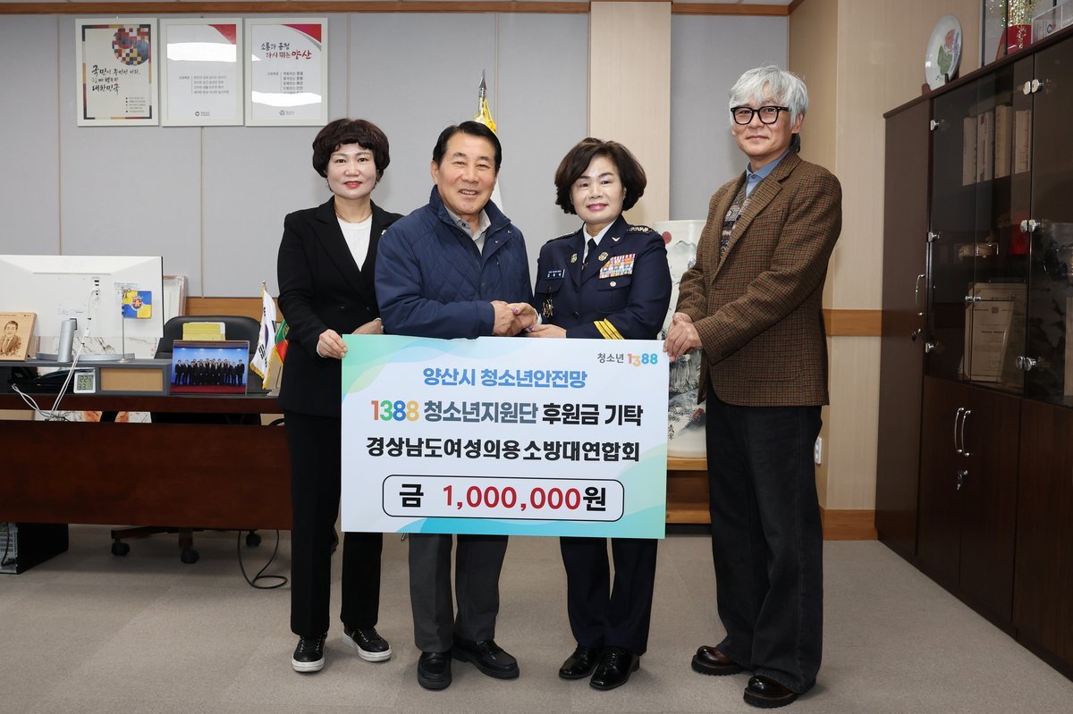 경상남도 여성의용소방대연합회 김복야 회장 취임 기념 양산시1388청소년지원단에 후원금 기탁 (양산시 제공) [PEDIEN] 경상남도 여성의용소방대연합회가 양산시청소년상담복지센터 1388청소년지원단에 후원금 100만원을 전달했다.이번 후원금은 김복야 회장의 취임을 기념하여 마련되었으며, 지역사회 위기 청소년들을 돕는 데 사용될 예정이다.여성의용소방대는 평소 화재 예방 활동과 생활 안전 지원 등 지역 사회의 안전을 위해 헌신하는 봉사단체다. 특히 여성 특유의 섬세함과 적극성을 바탕으로 지역 안전망 구축에 큰 역할을 하고 있다.김복야 회장은 지난 2월 6일 제26대 경상남도 여성의용소방대 회장으로 취임했다. 김 회장은 취임 후 첫 행보로 청소년 지원을 결정하며 나눔을 실천하는 리더십을 보였다.김 회장은 “어려움을 겪는 청소년들에게 조금이나마 도움이 되기를 바라는 마음으로 후원을 결정했다”며 “이번 후원이 청소년들이 건강하게 성장하는 데 밑거름이 되기를 희망한다”고 밝혔다.또한 “앞으로 경상남도 여성의용소방대 회장으로서 대원 간 화합을 도모하고, 지역사회를 위한 봉사활동에 적극적으로 참여하겠다”는 포부를 밝혔다.이성미 여성청소년과장은 “위기 청소년들을 위한 따뜻한 나눔에 깊이 감사드린다”며 “청소년들이 건강하게 성장하고 잠재력을 발휘할 수 있도록 지원을 아끼지 않겠다”고 말했다. -