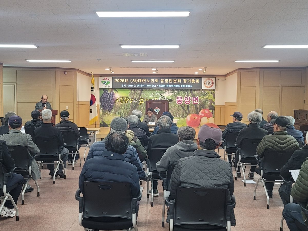 거창군 제공 [PEDIEN] 대한노인회 거창군지회 웅양면분회가 웅양면 행정복지센터에서 정기총회를 열고 지역 노인 복지 증진 방안을 논의했다.이번 총회에는 강창남 대한노인회 거창군지회장을 비롯해 웅양면 33개 경로당 회장 및 임원, 관계자 등 50여 명이 참석했다.총회에서는 2025년도 결산 보고와 함께 2026년도 주요 사업 계획 및 예산 심의가 진행됐다. 참석자들은 경로당 운영 활성화 방안에 대해 심도 깊게 논의했다.특히 고령화 시대에 발맞춰 노인 일자리 참여 확대와 건강 증진 프로그램 운영 등 어르신들의 삶의 질을 높이기 위한 다양한 의견이 제시됐다.신주범 웅양면 분회장은 회원들에게 감사를 표하며, 웅양면 노인회가 지역사회의 모범이 되고 노인들이 행복한 노후를 보낼 수 있도록 노력하겠다고 밝혔다.강선길 웅양면장은 어르신들에게 존경을 표하며 경로당 환경 개선과 행정 지원을 아끼지 않겠다고 약속했다.웅양면분회는 정기총회를 통해 투명한 회계 운영과 체계적인 사업 계획을 수립하고 있으며, 지역사회 봉사활동과 전통문화 계승 등 지역 발전에 기여하고 있다.