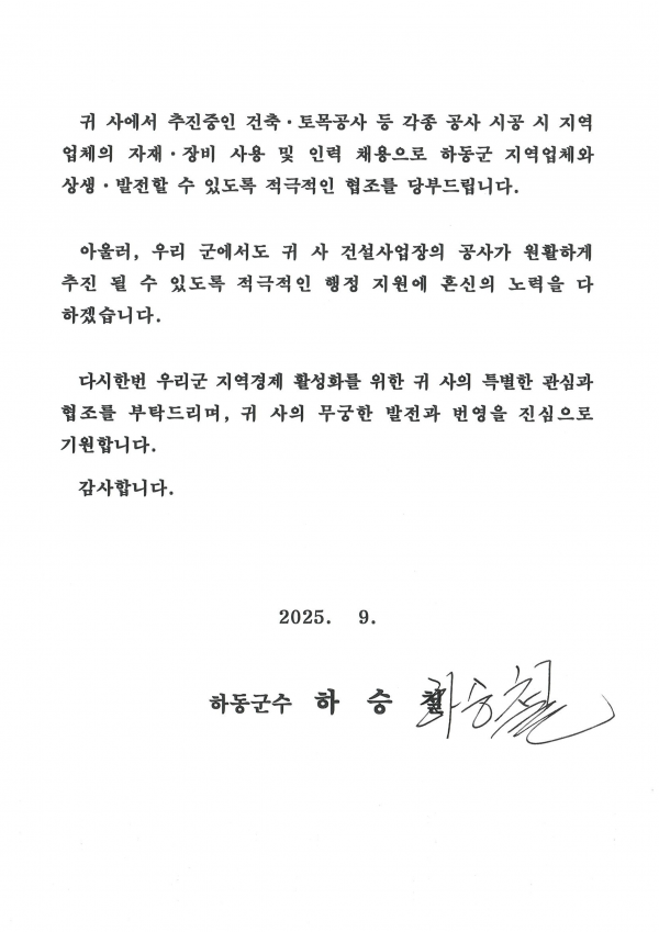 하승철 하동군수, 지역건설산업 활성화를 위한 서한문 발송
