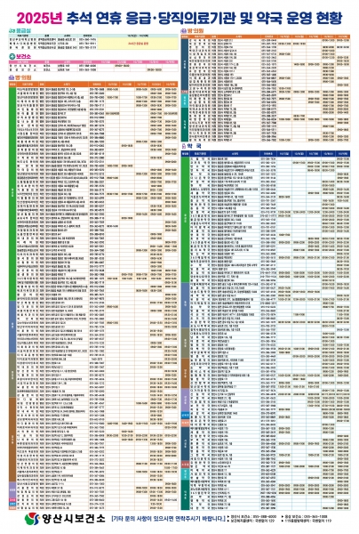 양산시 추석연휴, 653개 의료기관 428개 약국 운영 [PEDIEN] 양산시는 다가오는 추석 명절 연휴기간 동안 응급환자 발생 및 진료 공백 최소화를 위해‘비상응급대응체계’를 가동한다고 밝혔다. 응급환자 진료를 위해 양산부산대학교병원, 베데스다복음병원, 본바른병원 응급실을 24시간 운영하고 관내 의료기관 653개소와 약국 428개소를 연휴 기간 중 문 여는 병·의원, 약국으로 지정해 경증환자 진료 공백에도 대비할 방침이라고 전했다. 또 공공보건의료기관 연휴 기간 진료 동참을 위해 양산시보건소는 추석 당일 웅상보건소는 대체휴일인 10.8일 각각 정상 진료 예정이다. 아울러 재난·응급 상황에 신속히 대응하기 위해 ‘양산시보건소 신속대응반’을 편성해 연휴 기간 내내 주간에 종합상황실 근무, 야간에는 재택근무 체계로 전환해 긴급 상황을 유지할 방침이다. 연휴 동안 진료 가능한 의료기관과 약국 정보는 응급의료포털, 양산시청·보건소 홈페이지 또는 응급똑똑 앱에서 확인할 수 있다. 인터넷 사용이 어려운 시민들은 129 보건복지콜센터, 119 구급상황관리센터 전화 또는 당직 의료기관 및 약국 입구에 부착된 포스터로 운영시간을 안내받을 수 있다. 보건소 관계자는 “양산시는 추석 연휴 동안 시민과 귀성객 모두가 안전하고 편안한 명절을 보낼 수 있도록 비상진료체계를 철저히 운영하고 감염병 예방에도 최선을 다하겠다”고 전했다. -