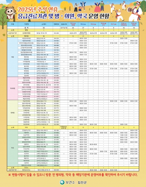 합천군, 2025년 추석 연휴 응급진료체계 운영 [PEDIEN] 합천군은 추석 명절 연휴기간동안 응급환자대비 및 군민과 귀성객의 의료공백을 최소화하고자 응급의료기관 및 문 여는 병의원·약국을 지정·운영한다. 연휴 기간 동안 합천군은 보건소에 응급진료상황실을 운영하며 오전 9시부터 오후 6시까지 근무하고 이후 시간에는 비상 연락망을 유지해 응급 상황에 신속히 대응할 계획이다. 상황실은 응급진료기관의 운영 현황을 점검하고 응급환자 비상진료기관 안내, 감염병 발생 모니터링 등을 담당한다. 합천군 보건소는 추석 연휴기간 동안 응급환자 발생에 대비해 △지역응급의료기관 삼성합천병원 24시간 응급실 운영 △보건소 비상진료 실시 △ 병·의원 37개소, 약국 15개소 지정·운영해 지역주민, 귀성객의 의료기관 및 약국 이용 불편을 최소화하고 안전한 추석 명절을 보낼 수 있도록 비상진료체계를 가동할 예정이다. 합천군은 응급진료정보가 원활하게 전달되도록 유선 안내와 함께 홈페이지, 스마트폰 앱, 주요 포털사이트를 통해 온라인 안내를 강화할 계획이다. 또한, 병·의원 및 약국 출입문에도 안내문을 부착해 연휴기간 동안 군민들의 불편을 최소화할 예정이다. 김윤철 합천군수는 “군민과 귀성객들의 즐겁고 편안한 추석 명절을 위해 연휴기간 응급진료체계 운영에 최선을 다하겠다”고 밝혔다. -