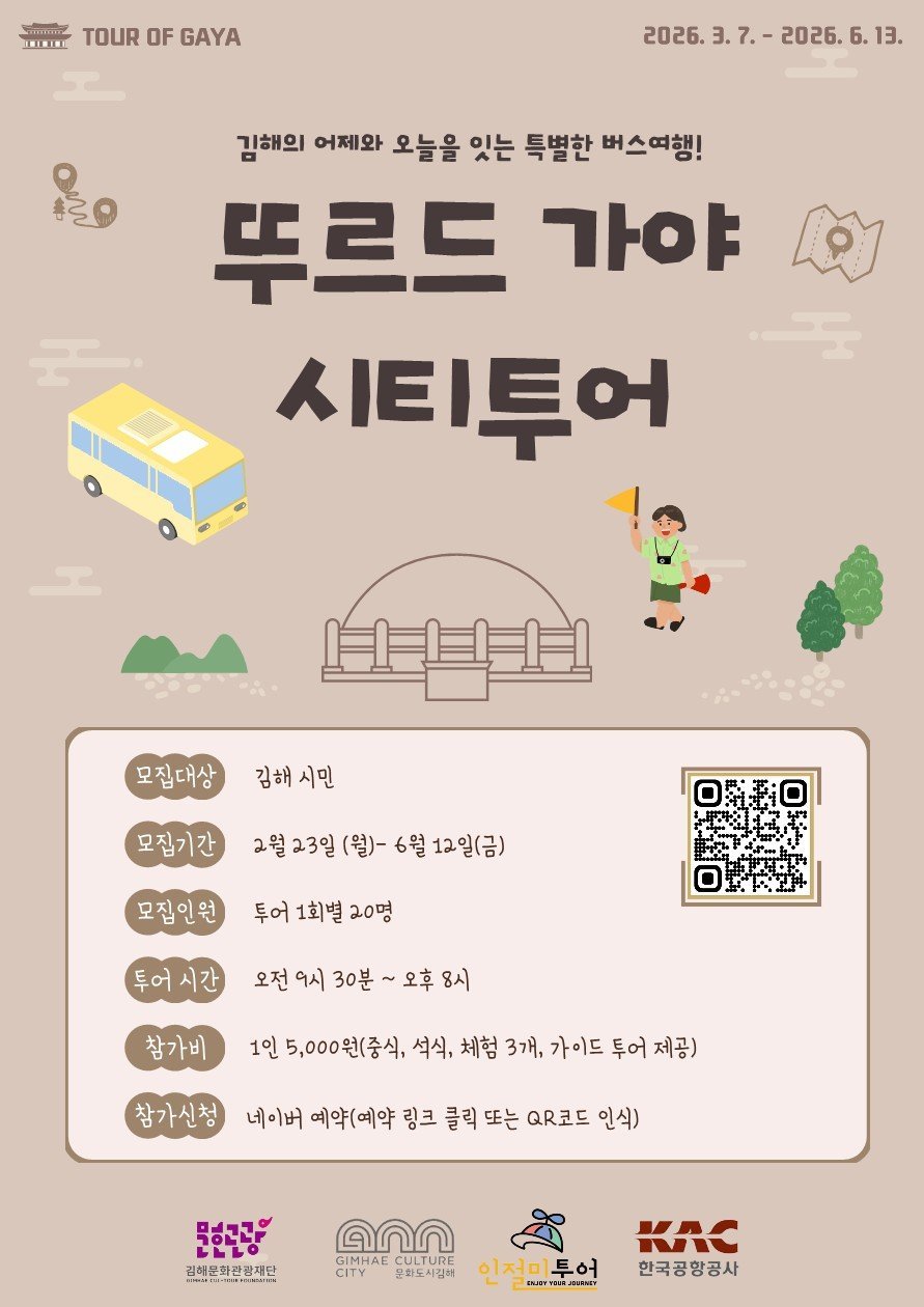 항공소음피해 지역 주민을 위한 특별한 김해여행 뚜르 드 가야 시티투어 참여자 모집 (김해시 제공) [PEDIEN] 김해시가 항공 소음으로 지친 주민들을 위해 특별한 시티투어 프로그램을 마련했다. '뚜르 드 가야'라는 이름으로 진행되는 이번 투어는 3월부터 6월까지 매주 토요일, 주민들에게 힐링의 시간을 제공한다.'뚜르 드 가야'는 프랑스어 'Tour'와 가야를 결합한 이름이다. 한국공항공사의 지원을 받아 김해의 역사, 문화, 자원을 체험하며 일상 속 스트레스를 해소할 수 있도록 기획되었다.투어 코스는 다채롭게 구성되어 있다. 원도심 탐방을 시작으로 와인동굴, 가야탈공방, 장군차 체험 농장, 분산성 노을 감상 등 김해의 매력을 듬뿍 느낄 수 있는 명소들을 방문한다.원도심에서는 대성동 고분군 박물관을 중심으로 외국인 거리와 봉리단길을 거닐며 과거와 현재가 공존하는 김해의 모습을 만나본다. 와인동굴에서는 미디어아트 콘텐츠를 관람하고, 가야탈공방에서는 탈 파우치 키링 만들기 체험에 참여한다.또한, 김해의 대표적인 특산물인 장군차 재배지를 방문하여 다도 체험을 하고, 분산성에서는 아름다운 노을을 감상하며 특별한 추억을 만들 수 있다.참가 신청은 2월 24일부터 네이버 예약 페이지를 통해 가능하다. 회차별 20명씩 선착순으로 모집하며, 소음피해대책지역 주민에게 우선 배정 기회가 주어진다. 미성년자는 단독으로 신청할 수 없다.조일웅 문화도시센터장은 "이번 프로그램이 항공 소음에 지친 주민들에게 작은 위로와 활력이 되기를 바란다"며, "앞으로도 지역 사회의 문제 해결을 위해 문화적인 노력을 지속할 것"이라고 밝혔다. -