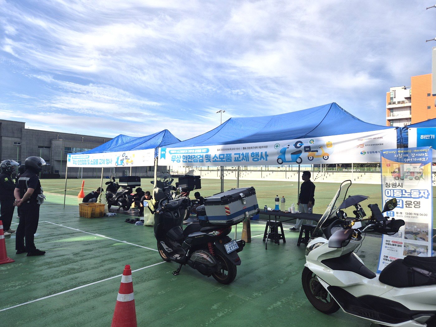 창원특례시-쿠팡이츠서비스, 배달종사자 이륜차 무상 안전점검 실시(지역경제과) (사진제공=창원시) [PEDIEN] 창원특례시가 배달 종사자들의 안전한 노동 환경 조성을 위해 이륜차 무상 안전점검 행사를 진행했다. 시는 쿠팡이츠서비스(유)와 협력하여 지난 15일부터 16일까지 이틀간 관내 배달 노동자들의 오토바이를 정밀 진단하고 주요 소모품을 무상으로 교체했다고 밝혔다.이번 안전점검은 창원시와 쿠팡이츠서비스가 배달 종사자의 안전 주행을 위해 체결한 업무협약(MOU)에 따른 후속 조치다. 15일에는 마산자유무역지역 2공구 운동장에서, 16일에는 창원축구센터 제2주차장에서 오전 9시부터 오후 4시까지 점검이 진행됐다.(사)한국오토바이정비협회가 현장에서 정밀 안전점검을 수행했으며, 특히 오일류와 브레이크 패드 등 안전에 직결되는 주요 소모품을 무상으로 교체했다. 친환경을 위한 배기가스 측정 서비스도 함께 제공되어 환경 개선에도 기여했다.또한, 경상남도 노사민정협의회는 안전한 배달 환경 조성 캠페인의 일환으로 오토바이용 소화기와 야광 암밴드를 지원했다. 이는 다가오는 겨울철을 앞두고 이동 노동자들이 보다 안전하게 일할 수 있도록 돕고 사고 예방을 위한 안전 수칙을 적극적으로 알리기 위함이다.허선희 지역경제과장은 “이번 안전점검이 이륜차 사고 예방과 이동노동자의 근무환경 개선에 실질적인 도움이 될 것으로 기대한다”며 “관내 이동노동자들이 안전하게 일할 수 있는 환경을 조성하기 위해 최선을 다하겠다”고 강조했다.한편, 창원시는 이동노동자들의 휴식과 재충전을 위한 지원 시설 운영에도 힘쓰고 있다. 현재 창원 이동노동자 지원센터(성산구), 마산 이동노동자 쉼터(마산합포구), 진해 이동노동자 쉼터(진해구) 등 총 3개소를 운영하며 노동 환경 개선 노력을 이어가고 있다. -