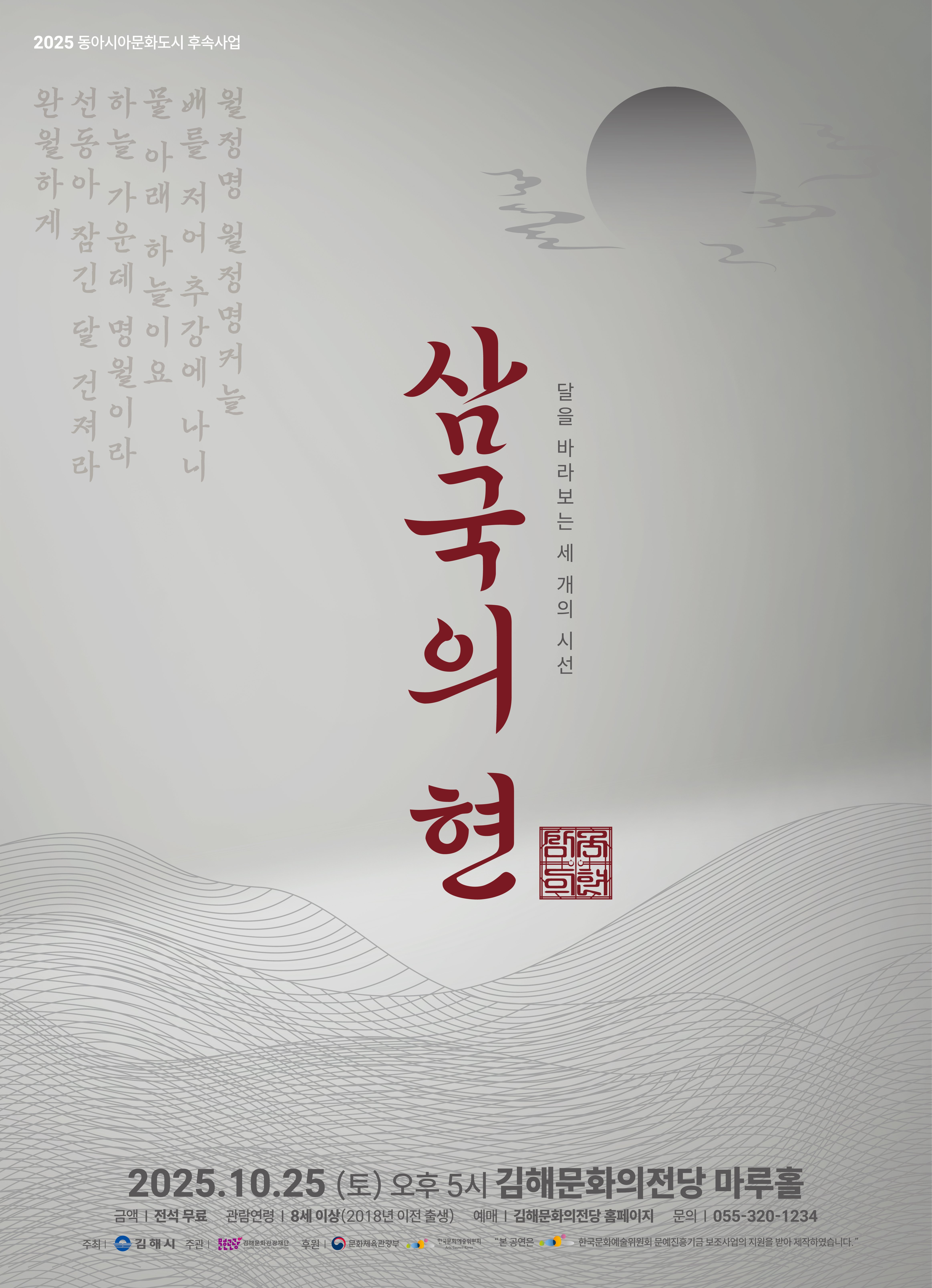 2024년 삼국의 현 – 달을 바라보는 세 개의 시선 공연 (사진제공=김해시) [PEDIEN] (재)김해문화관광재단 김해문화의전당이 한국, 중국, 일본 세 나라의 전통 현악 예술을 한데 모은 특별 공연 ‘삼국의 현’을 오는 25일 오후 5시 마루홀에서 선보인다.이번 공연은 2024 동아시아문화도시 김해 선정을 기념해 마련되었던 기존 무대의 후속 사업이다. 가야금의 고장 김해를 중심으로 중국의 고쟁과 일본의 고토가 어우러지며 동아시아 현악 예술의 교차점을 형상화하는 데 초점을 맞췄다.‘삼국의 현’은 세 나라의 전통을 현대적 감각으로 재해석하여 깊고 풍성한 울림을 전한다. 특히 이번 무대는 기존의 예술적 완성도에 대중성과 시각적 확장성을 더해 더욱 새롭고 풍성한 형태로 관객을 만날 예정이다.각국은 전통 시가와 감정을 현악 선율에 담아낸다. 한국은 시조 ‘월정명’의 풍류와 자연의 미를, 중국은 이백의 한시 ‘관산월’에 담긴 군사의 기개와 향수를 표현한다. 일본은 마쓰오 바쇼의 ‘하이쿠’를 통해 무상과 경외의 감정을 각국의 전통 악기로 전달한다.단순한 연주를 넘어 다층적인 무대 연출이 주목된다. 가야금, 거문고, 고쟁, 고토, 샤미센 등 동아시아를 대표하는 현악기의 선율을 중심으로 무용과 영상이 결합된다.즉흥 연주와 디제잉, 군무가 조화를 이루며 ‘달의 탄생에서 차오름까지’의 여정을 상징적으로 그려낸다. 이를 통해 세 나라의 예술 세계가 교차하는 환상적인 장면을 관객에게 선사할 전망이다.이태호 김해문화관광재단 문화예술본부장은 “서로 다른 문화가 공감으로 이어지고 전통과 현대가 함께 호흡하는 뜻깊은 무대”라며 “김해가 동아시아 예술 교류의 장으로 거듭나는 계기가 될 것”이라고 기대감을 밝혔다.한편, 공연에 앞서 지난 11일부터 25일까지 김해문화의전당 로비에서는 공연에 사용되는 각국의 전통 현악기를 미리 체험할 수 있는 ‘삼국의 현 로비 전시’가 진행 중이다.이번 특별 공연은 김해시가 주최하고 김해문화관광재단이 주관하며, 문화체육관광부와 한국문화예술위원회가 후원한다. 전석 무료로 진행되며, 자세한 내용은 김해문화의전당 홈페이지를 통해 확인할 수 있다. -