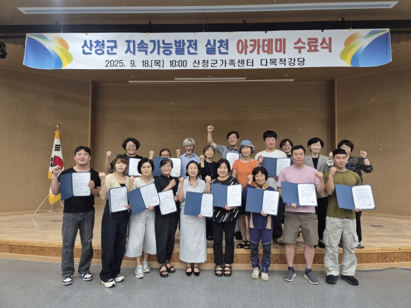 산청군, 지속가능발전 실천 아카데미 마무리 [PEDIEN] 산청군은 ‘2025 지속가능발전 실천 아카데미’ 과정을 마무리했다고 19일 밝혔다. 이번 교육은 경남도 주민참여예산 사업의 일환으로 지난 6월 26일부터 이달 18일까지 총 7회 과정으로 이뤄졌다. 교육에서는 ‘감정–공감–책임을 연결한 삶의 방향 설계’라는 주제로 △지속가능발전 목표와 지역발전 방안 △세대 간 상생 △건강과 복지 △기후변화 대응 △좋은 일자리와 지역경제 활성화 △교육 자원의 재탄생 △문화와 예술 등이 다뤄졌다. 특히 지리산도서관, 산엔청복지관 등 생활권 학습공간에서 운영하고 산청군농촌폐기물종합처리장 현장 견학도 진행돼 교육 효과를 높였다. 또 지역 전문가, 학계, 시민단체 강사진이 참여해 주민과 함께 사회·경제·환경적 과제를 고민하고 실천 가능한 방안을 모색해 의미를 더했다. 지난 18일 산청군지속가능발전협의회 주최로 열린 수료식에서는 수료생 20명 등이 참석해 지난 과정을 돌아보고 지속가능한 지역사회를 만들기 위한 의지를 다졌다. 하은희 산청군 기획예산담당관은 “이번 아카데미가 주민 스스로 지속가능발전 의미를 체감하고 일상에서 실천하는 계기가 되길 바란다”며 “앞으로도 지역사회와 지속가능발전 목표 달성을 위해 최선을 다하겠다”고 말했다. 한편 산청군지속가능발전협의회는 주민의 지속가능발전 이해도 제고와 실천 확산, 세대가 함께하는 지역 공동체 활성화를 위해 활동하고 있다. 또 이번 아카데미 수료생과 ESD 활동가 등을 주축으로 정기적인 스터디를 운영할 계획이다. -