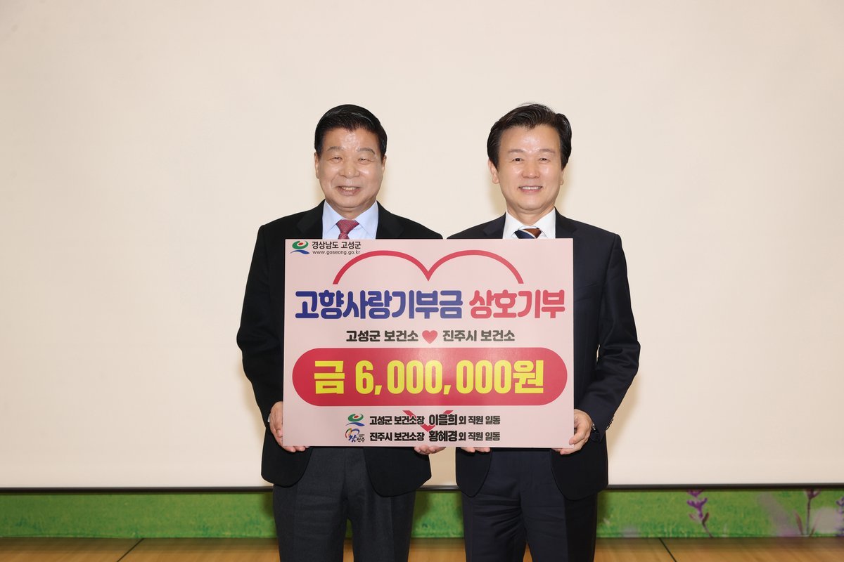 고성군·진주시보건소 직원들, 고향사랑기부금 상호 교차 기부 (경남고성군 제공) [PEDIEN] 고성군보건소와 진주시보건소는 2월 24일 고성군 유스호스텔에서 상생협력을 위한 고향사랑기부금 상호 교차 기부 행사를 진행했다.이번 기부는 고성군 공무원은 진주시에, 진주시 공무원은 고성군에 기부하는 상호 교차 방식으로 진행됐으며 양 기관 공무원 각 60명이 10만원씩 기부에 참여했다.이번 기부로 건전한 기부문화 확산 및 고향사랑기부제 활성화를 응원하고 지방재정을 확충해 침체된 경제에 활력을 불어넣는 긍정적 효과를 불러올 것으로 기대된다.아울러 고성군보건소와 진주시보건소는 이번 교차 기부를 계기로 업무 정보와 우수 사례를 공유해 협력 체계를 강화해 나갈 계획이며 군민들이 더 나은 보건 서비스를 받을 수 있는 상생 발전의 기반을 마련할 것으로 보인다.이을희 보건소장은 “2026년 고향사랑기부금 상호 기부를 통해 보건소 간 유대감을 더욱 공고히 하고 지속가능하고 실효성 있는 협력 방안을 모색하는 계기가 되기를 기대한다”고 말했다.한편 고향사랑기부제는 개인이 주소지를 제외한 다른 지방자치단체에 기부할 경우 세액공제 혜택과 함께 기부금의 30% 범위 내에서 답례품을 제공받는 제도이다.기부금은 지방재정 확충과 주민 복지 증진을 위해 사용되며 기부금액은 개인 연간 2천만원까지 가능하다. -
