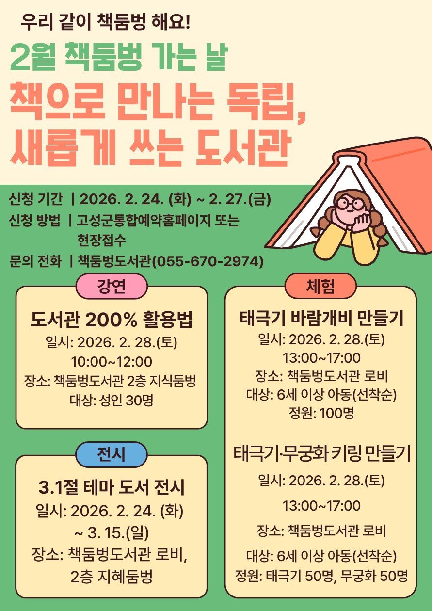매월 마지막 토요일은 '책둠벙 가는 날' 28일 강연부터 체험까지 '책으로 만나는 독립, 새롭게 쓰는 도서관'초대 (경남고성군 제공) [PEDIEN] 고성군 책둠벙도서관이 매월 마지막 토요일 운영하는 대표 브랜드 프로그램 ‘책둠벙 가는 날’을 맞아, 오는 28일 제107주년 삼일절의 의미를 되새기는 풍성한 프로그램을 선보인다.이번 행사는 ‘책으로 만나는 독립, 새롭게 쓰는 도서관’이라는 주제 아래, 군민들의 정보 접근 역량을 강화하는 전문 강연과 지역 자원봉사자들이 주도하는 참여형 체험 활동으로 꾸려진다.오전 10시에는 성인 군민을 대상으로 박형섭 강사의 ‘도서관 200% 활용법’특강이 열린다.단순한 도서 대출을 넘어 희망도서 신청, 큰글자도서 활용, 스마트 자료 검색법 등 실질적인 이용 꿀팁을 전수한다.특히 주민들이 직접 독서 동아리를 구성하거나 도서관 프로그램을 제안하는 등 도서관을 ‘지역 커뮤니티 거점’으로 활용하는 방안을 제시할 예정이다.오후 1시부터 5시까지는 자원봉사자들의 재능기부로 운영되는 ‘독립의 바람’체험존이 마련된다.아이들과 함께 방문한 군민들은 △태극기 바람개비 만들기 △태극기·무궁화 쉐이커 만들기 등 손으로 직접 역사적 상징물을 제작하며 삼일절의 숭고한 정신을 체험할 수 있다.도서관 내에는 삼일절의 가치를 담은 주제 도서 큐레이션이 상시 마련되어 방문객들에게 풍성한 볼거리와 깊이 있는 읽을거리를 동시에 제공할 예정이다.최다원 문화예술과장은 “매월 마지막 토요일 ‘책둠벙 가는 날’이 고성군민의 일상 속에 지식과 휴식을 채우는 소중한 시간으로 자리 잡길 바란다”며 “특히 이번 행사는 자원봉사자들의 헌신이 더해진 만큼, 많은 군민이 방문해 도서관의 가치를 200% 누리시길 기대한다”고 전했다.행사 참여는 도서관 홈페이지 및 SNS를 통한 온라인 접수와 현장 접수 모두 가능하다. -