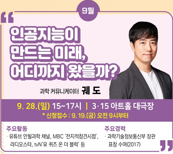 이번 강연은 “인공지능이 만드는 미래, 어디까지 왔을까?”라는 주제로 빠르게 발전하는 인공지능 기술이 사회와 일상에 미치는 영향과 앞으로 우리가 준비해야 할 과제에 대해 시민들과 함께 고민하고 소통하는 시간을 마련할 예정이다.