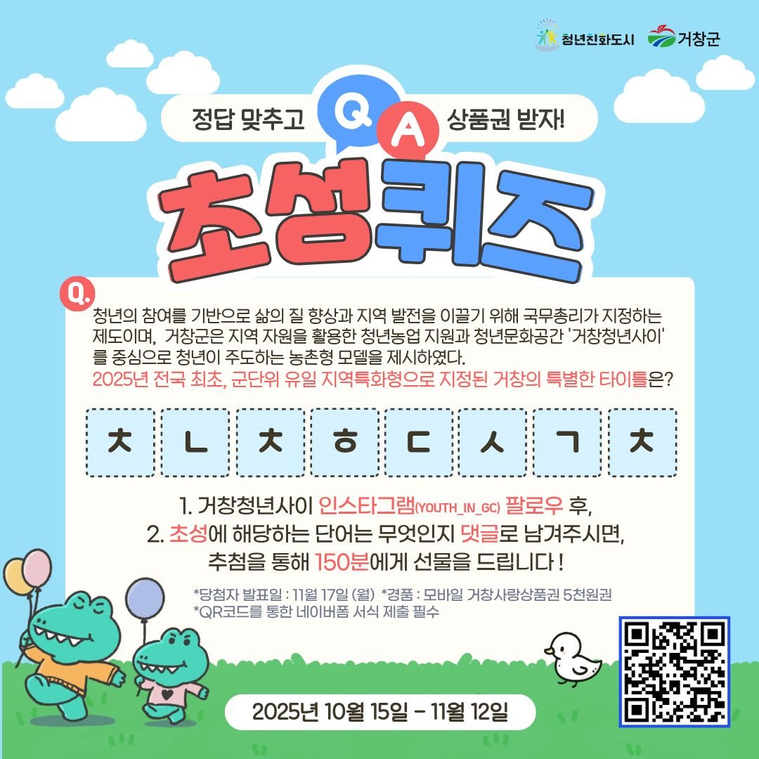인스타그램 포스터 (사진제공=거창군) [PEDIEN] 거창군이 대한민국 최초 청년친화도시 지정을 기념하며 청년 정책 홍보에 박차를 가한다. 군은 오는 10월 15일부터 11월 12일까지 한 달간 청년정책 공식 인스타그램 채널 ‘Youth_in_gc’를 통해 SNS 홍보 이벤트를 진행한다고 밝혔다.이번 이벤트는 청년이 행복하고 머물고 싶은 도시로 거창을 자리매김하기 위한 노력의 일환이다. 청년친화도시 거창의 인지도를 높이는 동시에, 실제 청년들의 정책에 대한 관심과 참여를 확대하는 데 주력한다.특히 청년 세대가 일상에서 손쉽게 참여할 수 있도록 온라인 소통 플랫폼을 활용해 친근하고 자발적인 참여 분위기를 조성할 예정이다. 참여 방법은 간단하다. 거창군 청년정책 공식 인스타그램 계정을 팔로우한 뒤, 이벤트 기간 중 게시되는 초성 퀴즈 게시물에 정답 댓글을 남기면 된다.이후 게시물 내 안내된 네이버폼 링크를 통해 이름과 연락처 등 인적 사항을 제출하면 응모가 완료된다. 군은 참여자 중 추첨을 통해 총 150명에게 모바일 거창사랑상품권 5,000원권을 증정하며, 당첨자는 이벤트 종료 후 개별 통보된다.거창군은 올해 2월 국무조정실로부터 군 단위에서는 유일하게 청년친화도시로 지정받는 성과를 거뒀다. 현재 1차년도 사업으로 청년 실태조사, 취·창업 교육, 청년 공간 구성 등 청년의 자립과 성장을 지원하는 다양한 정책을 추진 중이다.신순화 인구교육 과장은 “청년친화도시 지정은 청년이 머물고 함께 성장하는 지역으로 나아가기 위한 중요한 출발점”이라며 “이번 SNS 이벤트가 더 많은 청년이 거창의 정책과 다양한 사업에 관심을 갖는 계기가 되기를 기대한다”고 말했다.
