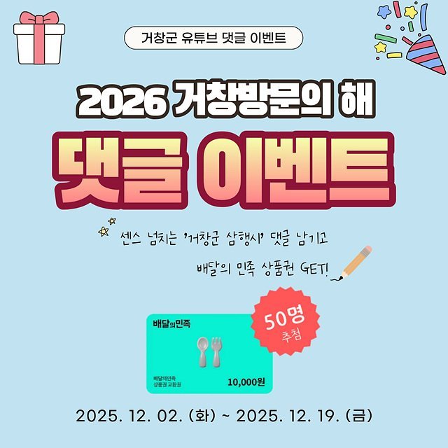 거창군 유튜브 채널, 홍보 이벤트 추진‘거창을 거창하게’크리에이터 영상 공모전 수상작 16편 소개 (거창군 제공) [PEDIEN] 거창군이 유튜브 채널을 통해 2일부터 19일까지 군 홍보 이벤트를 진행한다.이번 이벤트는 '거창 방문의 해'를 맞아 거창군의 매력을 알리고, 소셜미디어 채널을 활성화하기 위해 기획됐다. 특히, 지난 11월 '거창한 거창하게' 영상 공모전 수상작 16편을 순차적으로 공개하여 구독자들의 참여를 유도하고 있다.참여 방법은 간단하다. 거창군 유튜브 채널에서 이벤트 영상을 시청한 후, '거창 방문의 해'를 주제로 삼행시 댓글을 남기면 된다. 추첨을 통해 50명에게 '배달의 민족' 1만원 상품권을 증정하며, 당첨자는 23일 발표한다.거창군은 이번 이벤트를 통해 거창군의 다양한 소식과 관광 명소를 널리 알릴 수 있을 것으로 기대하고 있다. 군 관계자는 앞으로도 흥미로운 영상 콘텐츠를 지속적으로 제작하여 군정 홍보에 적극적으로 나설 계획이라고 밝혔다.한편, 거창군은 2011년부터 유튜브 채널을 운영하며 현재까지 5536개의 동영상을 게시했다. 블로그, 카카오톡 채널, 인스타그램 등 다양한 플랫폼을 통해 다각적인 홍보 활동을 펼치고 있다. -