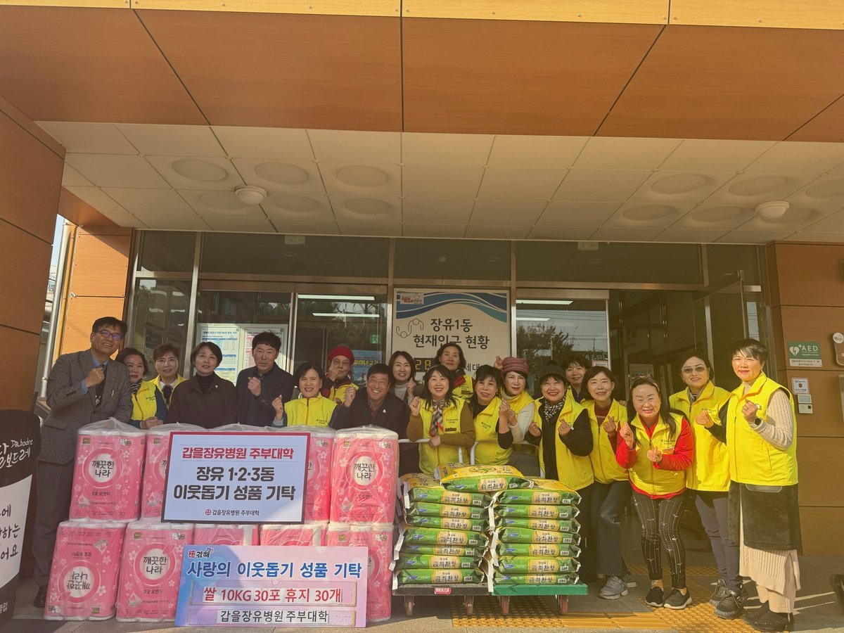 갑을장유병원 주부대학,장유123동에 생필품 180만원상당 기탁 (김해시 제공) [PEDIEN] 갑을장유병원 주부대학이 연말을 맞아 장유1·2·3동 행정복지센터에 180만원 상당의 생필품을 기탁하며 따뜻한 온정을 전했다.이번 기탁은 어려운 이웃을 돕기 위한 주부대학 회원들의 마음이 모여 이루어졌다.갑을장유병원 주부대학은 '여성들의 사회 참여 확대'라는 슬로건 아래 2005년 1기를 시작으로 최근 17기까지 870명의 졸업생을 배출했다. 지역 주민들의 유대 형성은 물론, 의료 사각지대에 놓인 이웃들을 위한 봉사활동과 기본적인 의료 상식 전달을 목표로 꾸준히 활동하고 있다.최순녀 주부대학 회장은 “주부대학에서 정성을 모아 마련한 생필품이 장유 지역 주민들에게 잘 전달되기를 바란다”며 “앞으로도 지역 주민들을 위한 다양한 봉사활동과 기부활동을 통해 지역사회를 돌보는 주부대학이 되겠다”고 밝혔다.이삼주 장유1동장은 “장유 지역사회를 위한 따뜻한 기부에 깊이 감사드린다”며 “어려운 이웃들에게 소중한 마음을 잘 전달하겠다”고 말했다.갑을장유병원 주부대학은 앞으로도 지속적인 봉사활동을 통해 지역사회에 기여할 계획이다. -