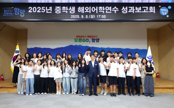 2025년 함양군 중학생 해외어학연수단 성과보고회 개최 [PEDIEN] 함양군은 8일 오후 5시 군청 대회의실에서 열린 ‘2025년 해외어학연수 프로그램 성과보고회’를 개최하고 14박 16일간의 영국 연수를 마친 학생들의 값진 경험과 성장을 공유하는 시간을 가졌다. ‘해외어학연수 프로그램’은 세계를 바라보는 폭넓은 시야와 성숙한 국제적 감각을 함양하고 글로벌 시대에 필요한 역량을 갖춘 인재를 양성하기 위해 2019년 처음 시작되어 올해 5기 배출했다. 올해 연수는 지난 7월 22일부터 8월 6일까지 14박 16일간 영국에서 진행됐으며 학생들은 어학 수업뿐만 아니라 역사와 문화, 예술 체험 등 다양한 학습과 체험 활동을 경험하며 세계를 향한 시야를 넓혔다. 이날 성과보고회에는 진병영 함양군수와 학생, 학부모 등이 참석했으며 연수 활동에 대한 전반적인 성과 보고를 시작으로 학생들이 현지 생활과 문화 체험을 통해 소중한 경험을 영상으로 공유했다. 이어 학생들의 진심이 담긴 감사 편지와 소감문 발표를 통해 연수 과정의 생생한 감동과 의미를 함께 나눴다. 진병영 함양군수는 “이번 연수를 통해 얻은 경험은 여러분의 미래를 밝히는 소중한 자산이 될 것”이라며 “앞으로도 배움과 도전을 지속적으로 이어가며 세계 속에서 당당히 빛나는 자랑스러운 인재로 성장해 주길 바란다”며 학생들이 내딛는 성장의 길에 희망과 용기를 더해줬다. 한편 함양군은 지역인재를 체계적으로 육성하고 글로벌 시대에 필요한 경쟁력 강화를 위해 △영어 캠프 △1:1 화상 영어 수업 △키스비전 프로그램 등의 다양한 맞춤형 교육사업을 지속적으로 추진해 나갈 계획이다. -