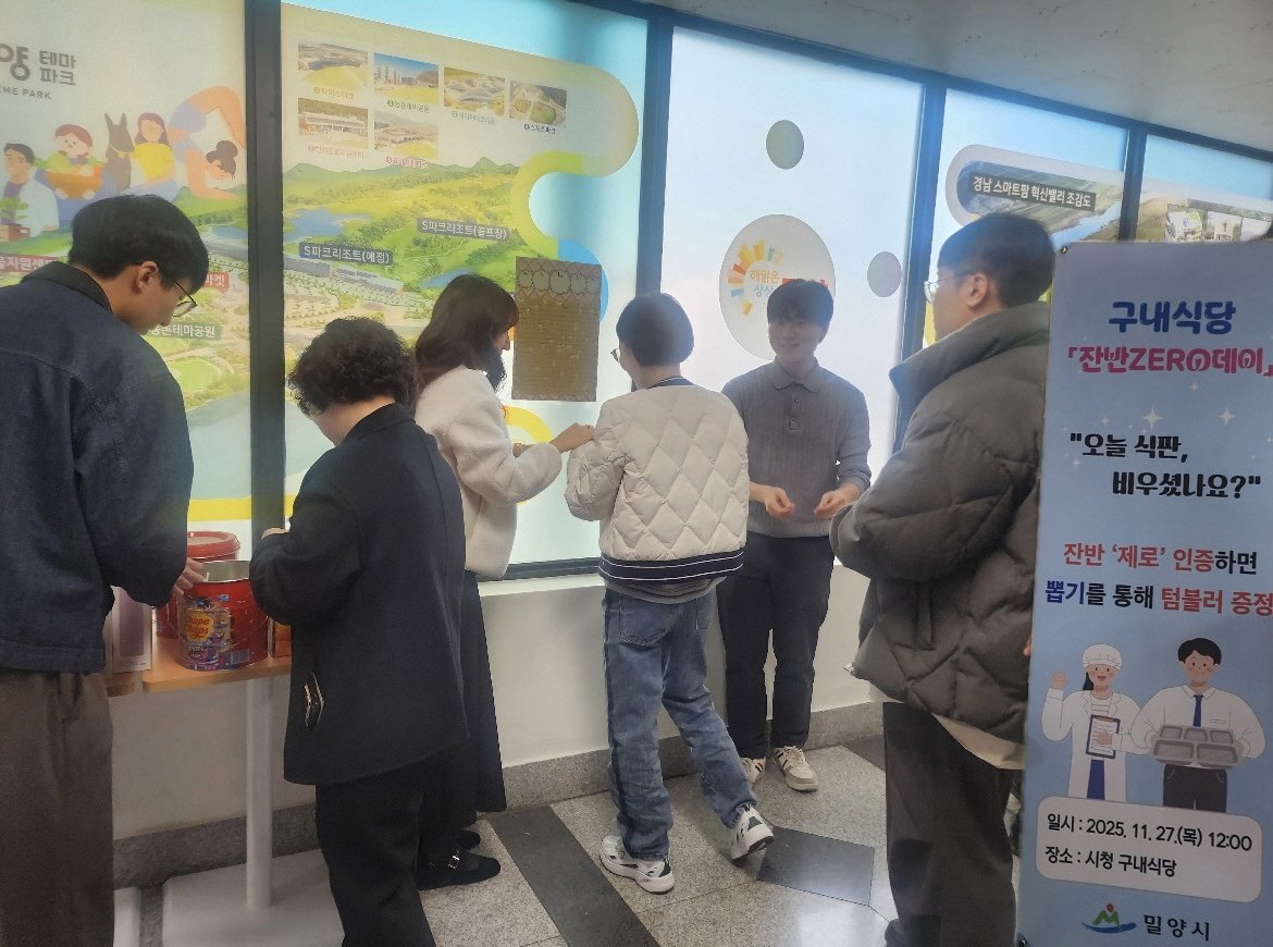 밀양시, 구내식당‘잔반 없는 날’이벤트 실시 (밀양시 제공) [PEDIEN] 밀양시가 시청 구내식당에서 직원들을 대상으로 '잔반 없는 날' 행사를 개최했다.이번 행사는 음식물 쓰레기를 줄여 환경 보호에 대한 인식을 높이고, 직원들에게 소소한 즐거움을 제공하기 위해 마련됐다.밀양시는 직원들이 식사 시 먹을 만큼만 음식을 덜어 잔반을 최소화하도록 유도하고, 잔반 없는 식판을 인증한 직원에게는 추첨을 통해 통컵을 증정했다.통컵을 제공함으로써 일회용품 사용을 줄이고 탄소중립 실천을 장려하려는 의도다.밀양시 관계자는 구내식당에서 시작되는 작은 실천이 음식물 쓰레기 감축과 탄소중립 실현에 기여할 것이라고 밝혔다.또한 이번 행사가 직원들에게 재미와 휴식을 제공하고, 환경 보호에 동참하는 계기가 되기를 기대한다고 덧붙였다. -
