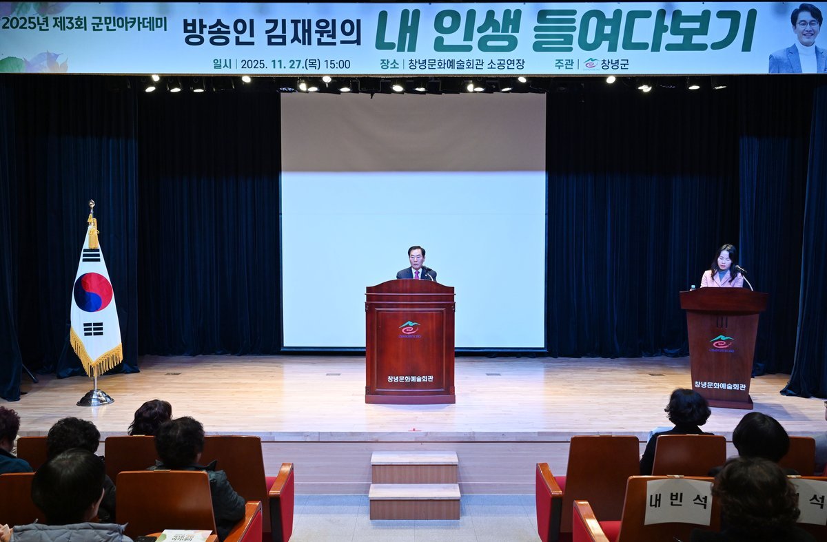 창녕군, 김재원 방송인 초청… 2025 군민아카데미 마무리 (창녕군 제공) [PEDIEN] 방송인 김재원이 창녕군민들을 만나 인생에 대한 깊이 있는 이야기를 나눴다.지난 27일, 창녕군은 김재원 전 KBS 아나운서를 초청하여 2025년 군민 아카데미의 마지막 강연을 성공적으로 개최했다고 밝혔다. 창녕문화예술회관 소공연장은 강연을 듣기 위해 모인 군민들로 가득 찼다.김재원은 '아침마당', '6시 내 고향' 등 다양한 프로그램 진행을 통해 3300회 이상의 생방송과 1만 건이 넘는 인터뷰를 진행한 베테랑 방송인이다. 현재는 한세대학교 교양학부 석좌교수로 재직하며 유튜브 채널 '김재원TV'를 통해 대중과 소통하고 있다.이번 강연에서 김재원은 '인생은 ○○이다'라는 질문을 던지며, 군민들이 스스로의 삶을 돌아보고 미래를 설계하는 시간을 가질 수 있도록 이끌었다. 특유의 유쾌한 입담과 진솔한 이야기로 강연 내내 군민들의 공감과 웃음을 자아냈다.창녕군은 이번 강연이 군민들이 자신의 삶에 더욱 집중하고 의미를 찾을 수 있는 계기가 되었기를 바라고 있다. 또한, 2026년에도 평생교육의 취지를 살려 더욱 다양한 분야의 명사를 초청, 유익한 강연을 제공할 계획이라고 밝혔다. -