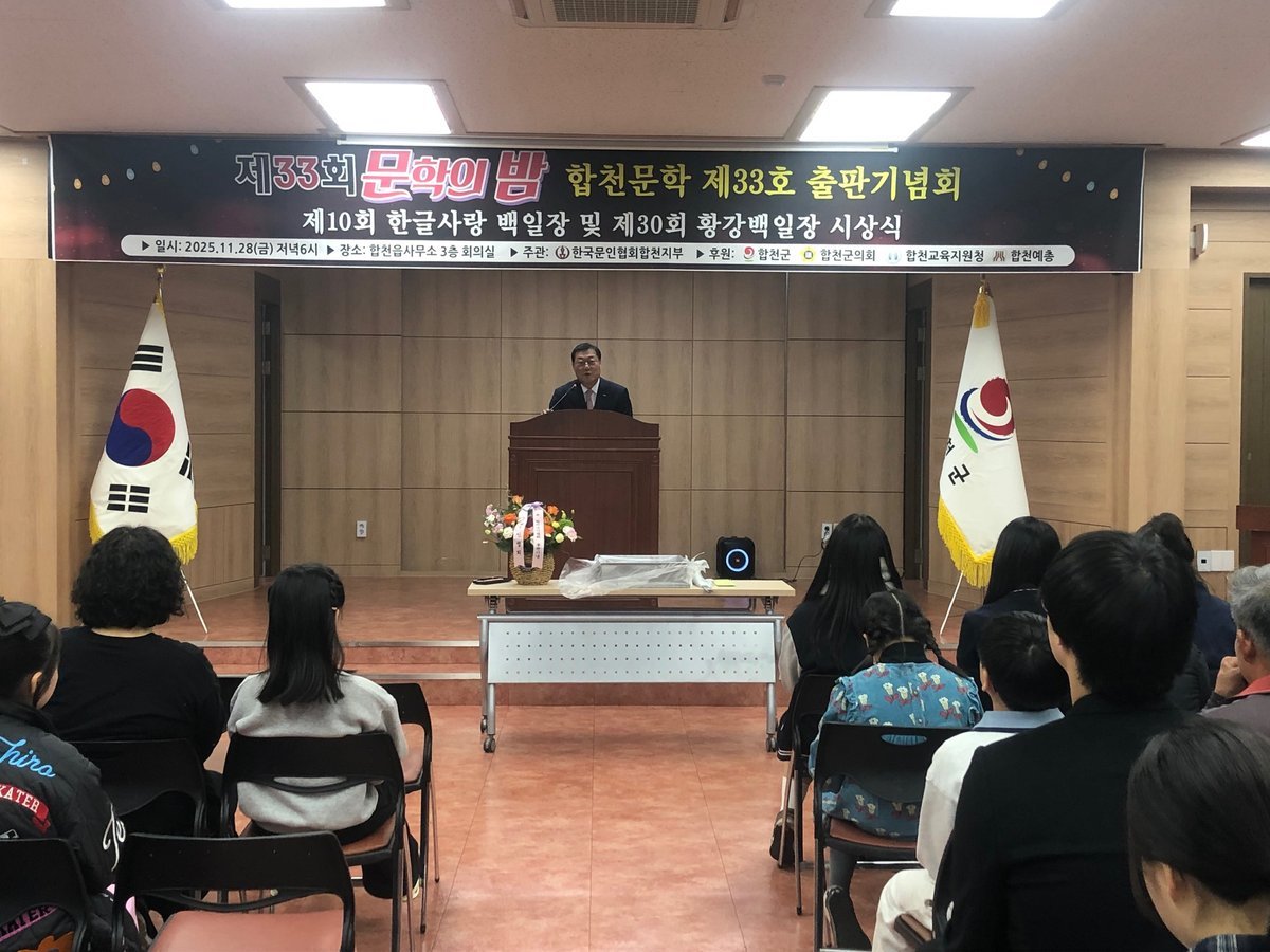 제33회 합천문인협회 ‘문학의 밤’성료 (합천군 제공) [PEDIEN] 합천문인협회가 주최한 '문학의 밤' 행사가 지난 28일 합천읍사무소에서 성황리에 개최됐다. 이번 행사는 지역 문인과 주민 100여 명이 참석하여 합천 문학의 밤을 함께 즐겼다.이번 행사는 합천문인협회 주관으로 진행되었으며, '합천문학' 제33호 발간을 기념하고 '한글사랑 백일장' 및 '황강 백일장' 시상식을 함께 진행하여 그 의미를 더했다.행사에서는 합천문학 33호 발간 기념 떡 케이크 커팅식이 진행되었으며, 이어서 한글사랑 백일장과 황강 백일장 시상식이 진행되었다. 다양한 분야에서 수상한 학생 및 일반 참가자들이 무대에 올라 축하를 받았다.최병태 합천문인협회 지부장은 인사말을 통해 합천 문학의 전통을 계승하고 창작 활동의 지평을 넓히는 데 기여한 문인과 군민들에게 감사의 뜻을 전했다.김윤철 합천군수는 문학이 지역의 문화적 품격과 정신을 담아내는 중요한 자산임을 강조하며, 앞으로도 문학을 중심으로 한 문화예술 활동이 더욱 활발해지기를 기대한다고 밝혔다.합천문인협회는 앞으로도 지역 문학 발전과 창작 활성화를 위해 다양한 문학 행사를 지속적으로 추진할 계획임을 밝혔다. 이번 '문학의 밤' 행사는 합천 지역 문학의 밝은 미래를 보여주는 뜻깊은 자리였다. -