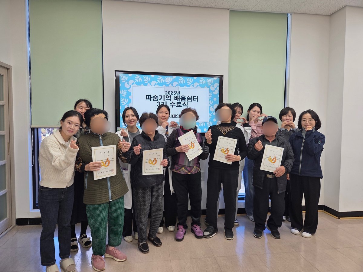 거창군 치매안심센터 ‘따숨기억 배움쉼터’3기 수료식 개최 (거창군 제공) [PEDIEN] 거창군 치매안심센터가 치매 환자 대상 '따숨기억 배움쉼터' 3기 프로그램을 성공적으로 마무리하고 수료식을 개최했다.이번 프로그램은 치매 환자들의 사회적 고립을 예방하고 삶의 질을 향상시키기 위해 마련됐다. 환자들이 쉼터에서 다양한 활동에 참여하며 사회적 접촉과 교류를 증진하고, 가족들에게는 돌봄 부담을 덜어주는 데 목적을 뒀다.프로그램은 치매예방체조, 인지치료, 공예활동, PC 활용 인지훈련 등 다채로운 내용으로 구성됐다. 특히 이동이 불편한 어르신들을 위해 이동 편의 서비스도 제공하며, 9월부터 주 3회, 1일 3시간씩 총 36회기로 진행됐다.쉼터 이용자들은 다양한 놀이 활동을 통해 즐거운 시간을 보냈으며, 다른 사람들과 소통하며 소중한 경험을 쌓았다고 소감을 밝혔다. 내년에도 참여하고 싶다는 의사를 밝히기도 했다.이정헌 거창군치매안심센터장은 어르신들이 무사히 프로그램을 마친 것에 대해 기쁨을 표하며, 앞으로도 치매 환자와 가족들이 지역사회 안에서 안심하고 생활할 수 있도록 다양한 돌봄 및 인지 강화 프로그램을 지속적으로 운영할 계획이라고 밝혔다.한편, 치매환자쉼터는 거창군 치매안심센터에 등록된 경증 치매 환자를 대상으로 운영된다. 자세한 사항은 치매안심센터에 문의하면 안내받을 수 있다. -