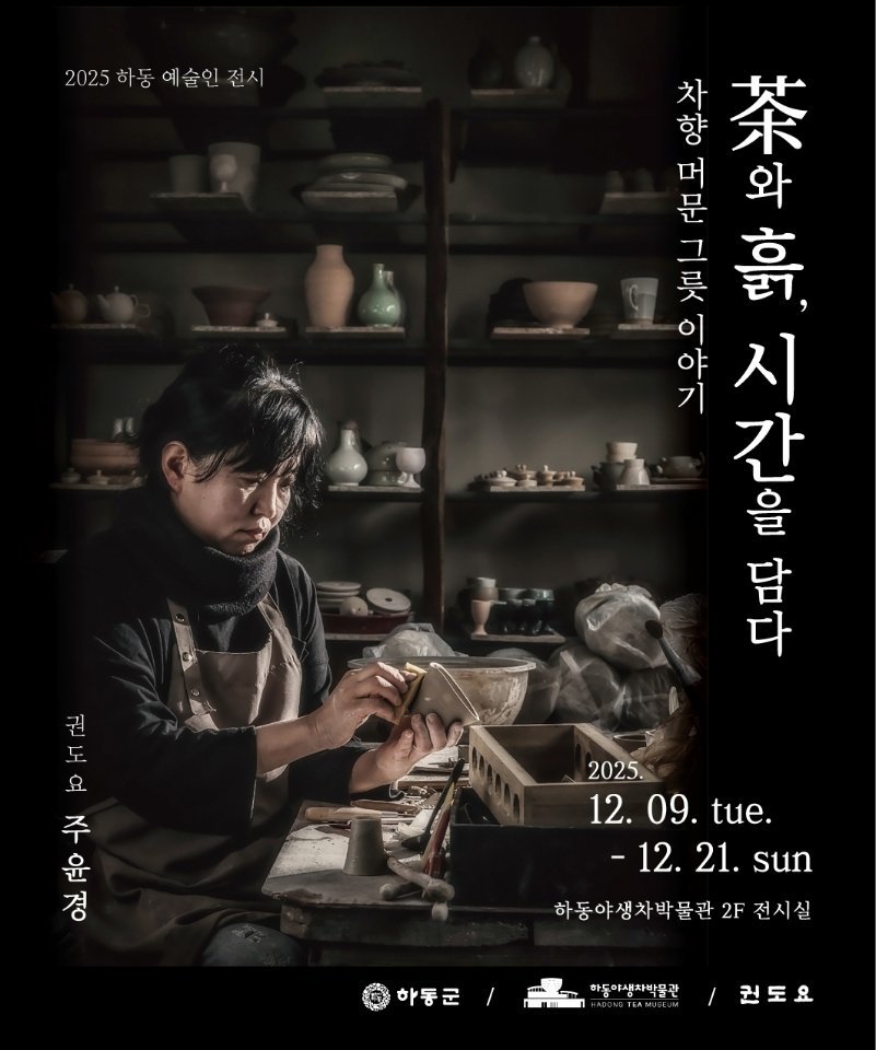 하동야생차박물관, 도예전 ‘와 흙, 시간을 담다’개최 (하동군 제공) [PEDIEN] 하동군 야생차박물관에서 도예가 조윤경의 도예전 '와 흙, 시간을 담다: 차향 머문 그릇 이야기'가 12월 9일부터 21일까지 열린다.이번 전시는 지역 예술인의 창작 활동을 지원하고, 예술 작품을 통해 현대 차 문화의 변화를 조명하기 위해 기획됐다. 하동의 문화·예술적 확장을 도모하는 데 목적을 둔다.특히 하동에서 활동하는 예술가의 작품을 전시함으로써 지역 예술을 널리 알리고, 지역 문화 정체성을 강화하는 데 기여할 것으로 보인다.전시에서는 찻사발, 찻잔, 다기 세트 등 다례와 관련된 실용적인 도자 작품을 중심으로 생활 도예의 미학을 선보인다. 조윤경 작가는 한국 전통의 미감에 일상에서 편안하게 사용할 수 있는 형태와 색감을 더한 작품을 선보인다.전시 작품 중 하동군 옥종면의 흙으로 빚은 다기는 흙의 물성을 섬세하게 살려낸 것이 특징이다. 하동 흙 본연의 질감과 색감에 작가의 조형미를 더해 작품의 완성도를 높였다.이번 전시는 차 문화와 흙의 결합을 통해 차 문화에 '시간의 예술'이라는 미학적 가치를 부여한다. 흙의 영속성과 차의 기다림을 결합하여 새로운 예술적 경험을 제공하고, 전통 미감에 현대적 감각을 더한 다기를 통해 차를 마시는 행위를 예술의 영역으로 확장한다.박물관 관계자는 이번 전시를 통해 관람객들이 차를 마시는 행위에서 흙과 자연, 기다림의 미학을 느낄 수 있기를 바란다고 밝혔다. 또한 한국 전통을 잇는 동시에 현대적인 감각으로 재해석한 조윤경 작가의 작품을 통해 차 문화의 깊이를 더하는 특별한 경험이 될 것으로 기대한다고 덧붙였다. -