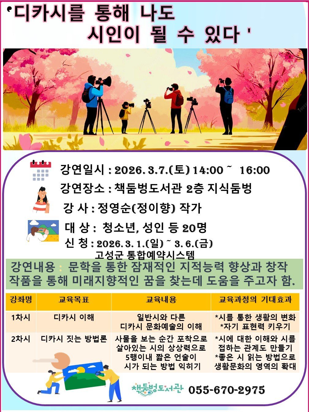 "디카시로 나도 시인이 된다"… 고성 책둠벙도서관, 정이향 작가 초청 강연 (경남고성군 제공) [PEDIEN] 디카시의 고장 고성, 책둠벙도서관에서 일상의 풍경이 시가 되는 특별한 경험이 시작된다.오는 3월 7일, 군민을 대상으로 ‘디카시로 나도 시인이 된다’특별 강연을 개최한다.이번 강연의 주제인 ‘디카시’는 디지털카메라나 스마트폰으로 자연이나 사물에서 포착한 시적 형상을 찍은 사진과 함께 짧은 문자로 표현한 시를 말한다.실시간으로 소통하는 디지털 시대의 새로운 문학 장르로 기존의 언어 예술을 넘어 사진과 문자를 하나의 텍스트로 결합한 ‘멀티 언어 예술’로 각광받고 있다.강연자로 나서는 정이향 작가는 디카시의 본고장인 고성에서 활발히 활동하며 대중과 소통해온 창작자로 이번 시간을 통해 누구나 스마트폰 하나만 있으면 시인이 될 수 있는 노하우를 아낌없이 전수할 예정이다.강연은 총 2부로 구성되어 깊이 있는 소통의 시간을 갖는다.1부 ‘디카시의 이해’시간에는 사진과 시가 결합된 디카시만의 독특한 매력을 짚어보고 우리 곁에 숨어있는 생활 속 예술의 가치를 발견하는 시간을 보낸다.이어지는 2부 ‘디카시 창작 방법론’에서는 사물을 바라보는 시선을 새롭게 기르는 법을 배우고 찰나의 순간을 압축된 언어로 표현해보는 실습 위주의 교육이 진행될 예정이다.최다원 문화예술과장은 “디카시는 사진과 문자가 결합된 멀티 언어 예술로서 현대인들이 가장 쉽고 빠르게 자신의 감성을 표현할 수 있는 도구”며 “이번 강연이 군민들에게 ‘나도 시인이 될 수 있다’는 자신감을 심어주고 일상의 소중한 순간을 예술작품으로 남겨보는 의미 있는 시간이 되길 기대한다”고 전했다. -
