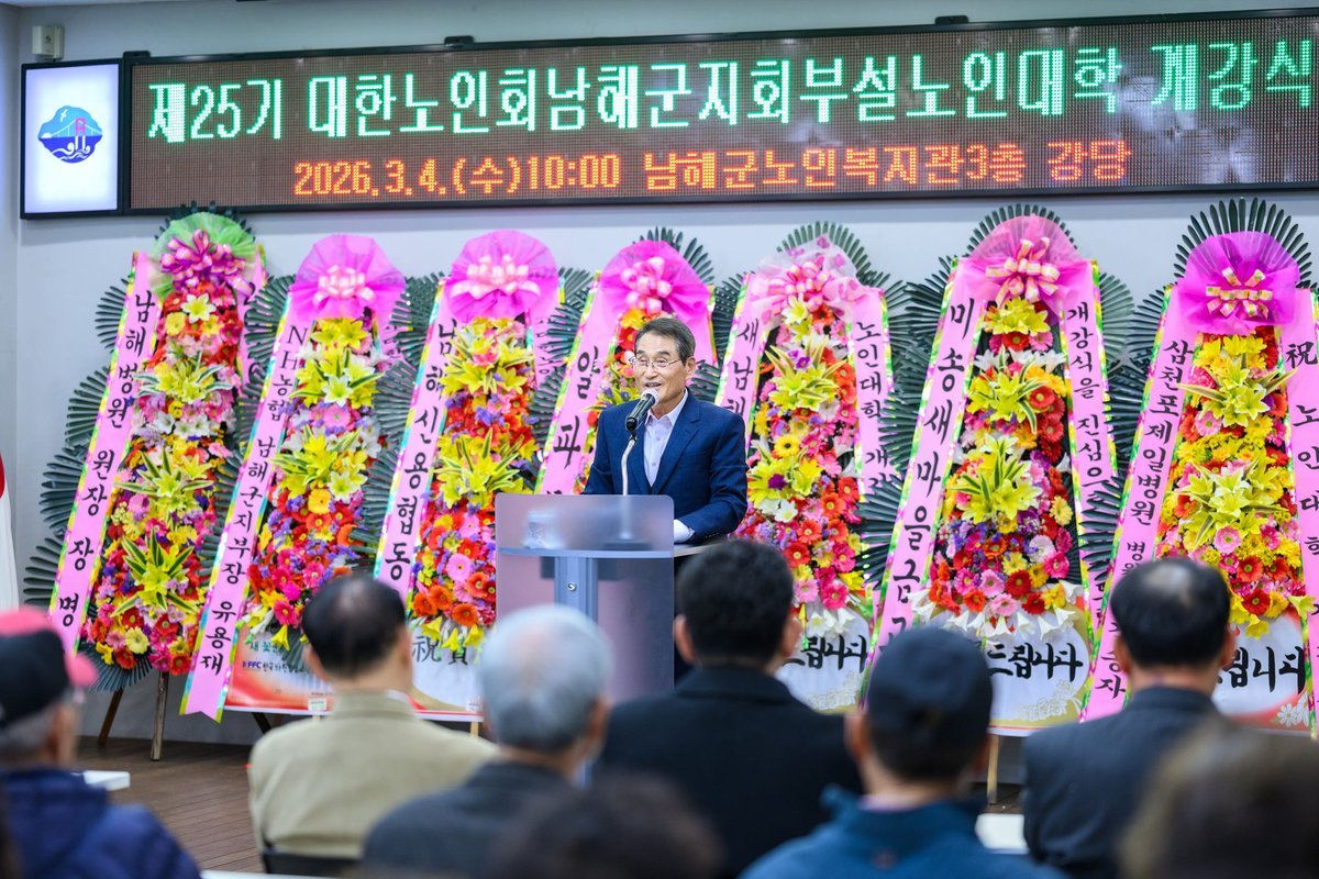 대한노인회 남해군지회 부설노인대학 제25기 개강식 (남해군 제공) [PEDIEN] 사)대한노인회남해군지회 부설노인대학은 지난 4일 남해군노인복지관 3층 강당에서 제25기 개강식을 열고 176명의 신입생을 맞이했다.대한노인회 남해군지회 부설노인대학은 2026년 제25기를 맞이했으며 해를 거듭할수록 여가 활동 및 건강한 삶을 지원하는 대표적인 기관으로 자리 잡고 있다.하종준 학장은 “배움은 사람을 젊게 만들고 웃음은 건강을 지킨다고 한다. 우리 노인대학에 오시는 모든 분들이 밝고 활기찬 웃음으로 가득한 시간을 보내시길 진심으로 바라며 그런 배움의 시간이 되도록 최선을 다해 지원할 것을 약속드린다”고 말했다.장충남 남해군수는“부설노인대학 개강을 축하드리며 배움을 향한 어르신들의 도전과 열정에 깊은 존경의 마음을 전한다”며 “건강하고 행복한 노후를 위해 배움의 기회를 잘 활용하시길 바란다”고 말했다.한편 부설노인대학은 매주 수요일 9시부터 4시간 동안 민요장구, 레크레이션, 건강체조, 서예, 한궁, 특강 등 다양한 프로그램을 운영하고 있다. -