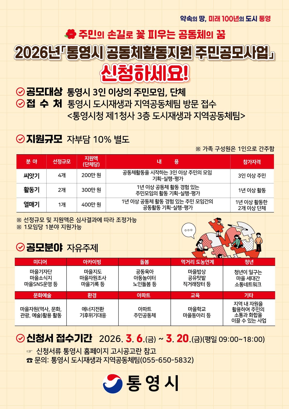 통영시 주민의 손길로 꽃 피우는 공동체의 꿈 통영시 제공 [PEDIEN] 통영시는 주민 스스로 계획하고 공동체적 방식으로 추진하는 활동을 지원하기 위해 2026년 통영시 공동체활동지원 주민공모사업 에 참여할 공동체를 오는 6일부터 20일까지 모집 접수한다.공동체활동지원 주민공모사업은 주민 참여를 기반으로 주민들 스스로 지역의 문제를 발굴하고 해결해 나가는 사업으로 지역의 특성과 필요에 맞는 실질적인 해결책을 도출해 지역사회의 자생적 발전을 촉진할 것으로 전망한다.지원자격은 마을공동체 활동에 관심이 있는 통영시에 거주하는 3인 이상 주민모임이며 주민모임 활동 단계에 따라 씨앗기 활동기 열매기로 구분해 운영할 계획이다.주민모임은 씨앗기 200만원, 활동기 300만원, 열매기 400만원을 선정해 활동을 지원할 계획이며 접수기간은 오는 6일부터 20일까지 통영시청 도시재생과로 직접 방문 신청해야 한다.공모사업에 대한 신청서류 및 자세한 사항은 시 홈페이지 고시공고에서 확인할 수 있으며 도시재생과 지역공동체팀으로 문의하면 된다. -