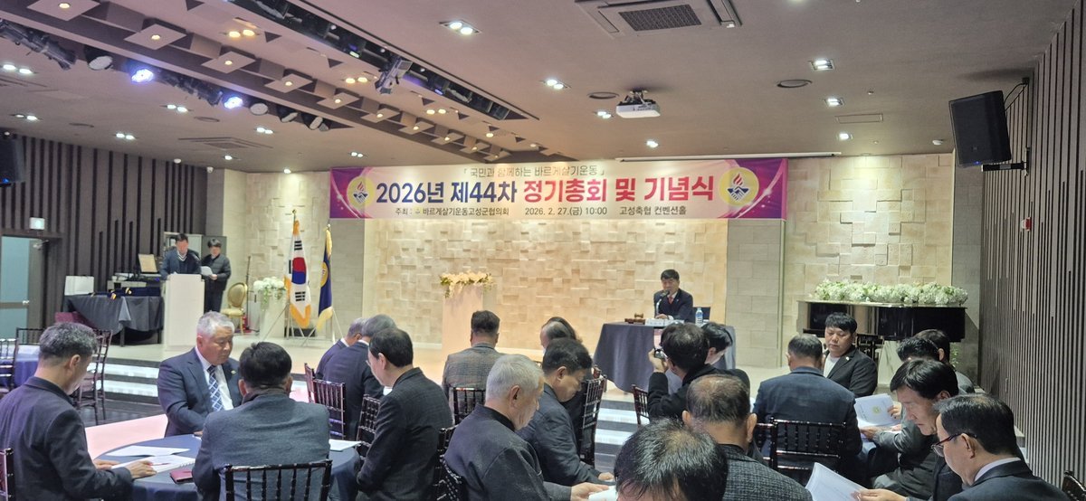 바르게살기운동 고성군 협의회 제44차 정기총회 개최 (경남고성군 제공) [PEDIEN] 바르게살기운동 고성군협의회는 2월 27일 고성축협 컨벤션홀에서 제44차 정기총회를 개최했다.이날 행사에서는 바르게살기운동 행동강령을 낭독하며 바르게살기운동의 핵심가치를 되새겼으며 2025년 주요 사업 활동을 담은 영상을 시청하며 지난 한 해를 돌아보는 시간을 가졌다.또한, 지역사회 발전과 바르게살기운동 고성군협의회 발전에 기여한 우수회원 17명에게 표창이 수여됐다.수상자는 군수상 배기완, 박덕용, 이환수, 김문태, 이복연, 이상복, 정은아, 국회의원상 차영란, 윤종호, 이판준, 고성군의장상 김재숙, 전행보, 김유재 경찰서장상 임학래, 김춘호 고성군협의회장상 강혜정, 구미경이다.박성재 회장은 “지난 한 해 동안 회원들의 다양한 봉사활동을 통해 지역사회에 의미 있는 변화를 만들어낸 것 같다”며 “2026년에도 더 적극적인 봉사활동으로 고성군의 발전을 위해 최선을 다하겠다”고 말했다.군 관계자는 “바르게살기운동은 진실, 질서 화합의 3대 이념을 바탕으로 선진 시민의식을 높이고 군민통합과 사회정의 구현을 통해 건강한 지역사회 조성에 앞장서고 있다”며 “열정적인 봉사로 지역사회의 발전을 이끌어주신 회원 여러분께 깊이 감사드리며 올 한해도 변함없는 사명감과 열정으로 더 나은 고성군을 만들어가기 위해 힘써주시기 바란다”고 전했다.한편 바르게살기운동 고성군협의회는 지역사회 발전과 공동체 의식 함양을 위해 환경정화운동, 법질서확립캠페인, 도덕성회복강연회, 읍면활성화사업, 취약계층 나눔봉사 등의 활동을 지속적으로 전개하며 건강한 사회 분위기 조성에 앞장서고 있다. -