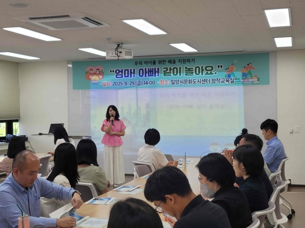 밀양시, 직원 대상 부모 교육 개최 [PEDIEN] 밀양시는 29일 밀양문화도시센터에서 미취학 자녀를 둔 직원 40여명을 대상으로 부모 교육을 진행했다. 이번 교육은 가정 친화적인 직장 문화 조성과 자녀 양육 지원을 통해 가정의 행복과 직장 생활 만족도를 높이기 위해 마련됐다. 강의는 육아전문가인 강정아 밀양시청반디어린이집 원장이 맡았으며 ‘우리 아이를 위한 배움 지원하기’라는 주제로 자녀 교육법과 양육 노하우를 공유했다. 현윤희 행정지원과장은 “자녀 양육의 어려움을 함께 나누고 부모로서의 자신감을 높일 수 있도록 이번 교육을 준비했다”며 “가정의 안정과 행복이 직장 내 만족도와 생산성 향상으로도 이어지기를 기대한다”고 밝혔다. 밀양시는 앞으로도 가정과 직장이 조화를 이루는 근무 환경 조성을 위해 다양한 프로그램을 확대해 나갈 계획이다. -