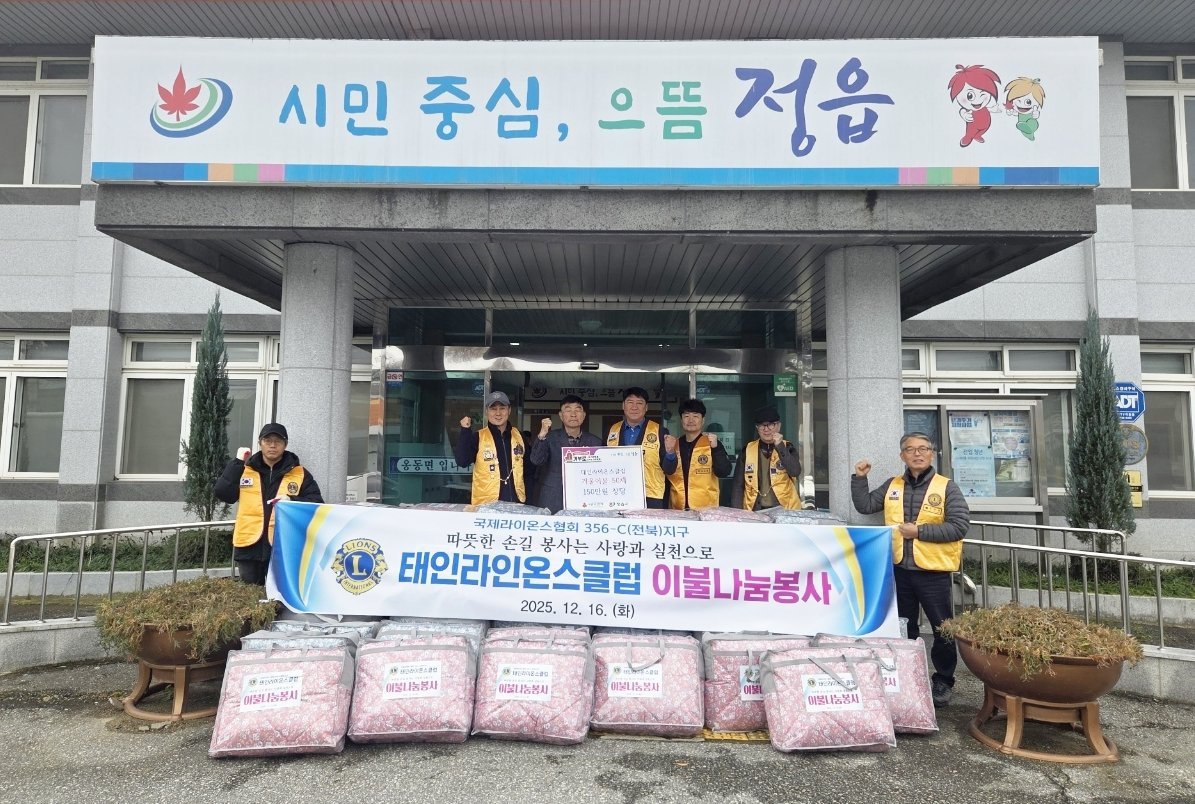 정읍 태인라이온스클럽, 태인·옹동면에 사랑의 이불 100채 기탁 (정읍시 제공) [PEDIEN] 국제라이온스협회 전북지구 태인라이온스클럽이 연말을 맞아 태인면과 옹동면을 잇따라 방문하며 지역 사회에 따뜻한 온기를 불어넣었다.태인 라이온스클럽은 지난 16일 두 지역의 소외 계층을 위해 겨울 이불 총 100채를 기탁했다.이번 나눔은 태인라이온스클럽이 매년 이어오고 있는 연례 봉사 활동의 일환으로, 본격적인 한파가 예고된 겨울철을 맞아 난방 취약계층의 건강하고 따뜻한 겨울나기를 지원하기 위해 마련됐다.이날 조동만 회장을 비롯한 회원들은 태인면사무소와 옹동면사무소를 각각 방문해 이불 50채씩을 전달했다.기탁된 이불은 각 지역의 소외된 이웃들에게 골고루 배분된다.태인면은 이장협의회를 통해 관내 47개 마을 소외계층에게, 옹동면은 지역 사정에 밝은 직원들을 통해 독거 어르신과 장애인 가구 등 50세대에 신속하게 전달할 예정이다.조동만 회장은 “연말이 되면 취약계층 분들이 심리적으로나 물리적으로 더 춥고 외로운 시기를 보내는 것 같아 회원들의 정성을 모아 이불을 준비했다”며 “작은 정성이지만 소외된 이웃들이 따뜻한 겨울을 나는 데 도움이 되길 바라며, 앞으로도 지역 사회와 호흡하며 봉사 활동을 꾸준히 이어가겠다”고 전했다.김상철 옹동면장과 김용천 태인면장은 “매년 잊지 않고 우리 지역의 어려운 이웃을 위해 꾸준히 나눔을 실천해 주시는 태인라이온스클럽에 진심으로 감사드린다”며 “기탁해 주신 이불은 도움이 꼭 필요한 이웃 한 분 한 분께 회원들의 따뜻한 마음과 정성까지 담아 소중히 전달하겠다”고 화답했다.한편, 태인라이온스클럽은 이번 이불 나눔 외에도 매년 연탄 나눔, 장학금 지원, 백미 기탁 등 지역 사회 소외계층과 상생하는 다양한 사회공헌 활동을 지속적으로 실천하며 지역 복지 발전의 든든한 주축이 되고 있다. -