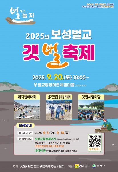 보성군, “뻘에서 놀자” 2025 보성벌교 갯뻘축제 개최 [PEDIEN] 보성군은 오는 9월 20일 벌교읍 장양어촌체험마을 일원에서 ‘2025 보성벌교 갯뻘축제’를 개최한다고 밝혔다. 이번 축제는 ‘뻘에서 놀자’라는 주제로 보성벌교갯뻘축제 추진위원회가 주최·주관하며 유네스코 세계자연유산으로 등재된 보성벌교갯벌과 국가중요어업유산 제2호 보성뻘배어업의 가치를 널리 알리는 가족 친화형 생태 문화 축제로 추진된다. 축제는 이날 오전 10시 30분 개막식을 시작으로 본격적인 막을 올린다. 개막식에서는 벌교갯벌의 생태적 상징성을 담은 ‘깃대종 알락꼬리마도요’ 선포식이 열려, 생태 보호의 공감성을 함께 나누는 퍼포먼스가 진행된다. 축제의 백미는 단연 제10회 레저뻘배대회다. 뻘배는 갯벌 위를 미끄러지듯 달리는 전통 어업 도구다. 뻘배를 직접 타고 갯벌을 가르며 달려보는 경험은 아이들에게 모험심을, 어른들에게는 잊지 못할 추억을 안겨줄 것이다. 올해 처음 도입되는 ‘벌교갯뻘길 생태걷기대회’는 오후 2시부터 4시까지 진행된다. 장양어촌체험마을 주무대에서 출발해 벌교생태공원까지 왕복 7.4km 코스로 짱뚱어코스와 마도요코스로 나뉘어 운영된다. 특히 이번 대회는 현재 보성군이 추진 중인 ‘벌교~장도간 생태탐방로드 조성사업’, ‘보성 벌교갯벌 생태계 복원사업’과 연계돼, 철새와 다양한 갯벌 생물을 가까이에서 관찰할 수 있는 블루관광의 모범사례로 자리매김할 전망이다. ‘벌교갯벌 레저뻘배대회’ 와 ‘벌교갯뻘길 생태걷기대회’ 참가 신청은 오는 9월 18일까지 보성군청 누리집 네이버폼을 통해 가능하며 대회 당일인 9월 20일에는 오전 10시 30분까지 현장 접수도 진행된다. 또한, 벌교갯벌 홍보 전시관과 바닷새 사진전 등 교육적 볼거리도 마련돼 있다. 체험과 학습이 어우러지는 프로그램이 풍성하게 준비돼 가족 단위 방문객들에게 큰 호응을 얻을 것으로 기대된다. 이 외에도 갯벌 풋살대회, 물고기 맨손잡기, 뻘배 체험존, 숯불구이 체험 등 남녀노소 누구나 즐길 수 있는 프로그램이 풍성하다. 하루 종일 갯벌에서 뛰고 구르며 자연과 하나 되는 시간은 도시에서 쉽게 누릴 수 없는 특별한 경험이 될 것이다. 김길두 추진위원장은 “2025 보성벌교 갯뻘축제는 갯벌 문화를 계승하고 발전시키는 자리이자, 지역의 생명력과 생태적 즐거움을 직접 체험할 수 있는 뜻깊은 시간이 될 것”이라며 “아이들과 함께 오셔서 마음껏 뛰놀고 배우는 하루를 보내시길 바란다”고 전했다. -
