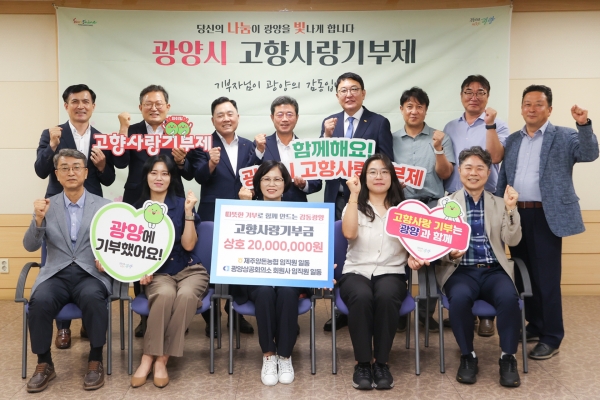 광양상공회의소·제주양돈농협, 고향사랑 기부금 상호 2,000만원 전달 [PEDIEN] 광양시는 지난 9월 9일 광양상공회의소 회원사 임직원과 제주양돈농협 임직원 일동이 서로의 지역에 고향사랑 기부금 각 2,000만원을 전달하며 지역 상생 발전을 위한 나눔을 실천했다고 밝혔다. 특히 올해는 광양상공회의소 임직원뿐 아니라 회원사 임직원까지 동참해 지난해보다 기부 규모가 확대되면서 지역사회 발전을 위한 동참의 의미가 더욱 커졌다. 고권진 제주양돈농협 조합장은 “광양과 제주가 지리적으로 가까운 곳은 아니지만, 마음을 잇는 고향사랑기부제를 통해 지역 간의 상생 발전과 교류가 더욱 활발해지기를 기대한다”며 “앞으로도 나눔 활동을 꾸준히 이어가겠다”고 말했다. 우광일 광양상공회의소 회장은 “지난해에 이어 올해도 제주양돈농협과 함께 고향사랑 상호기부를 이어가며 의미 있는 연대와 교류를 실천하게 돼 기쁘다”며 “적극적으로 참여해 준 회원사 임직원 여러분께도 감사의 말씀을 드린다”고 소감을 밝혔다. 정인화 광양시장은 “양 기관이 2년 연속 고향사랑 상호기부를 이어가며 지역 간 상생 발전의 모범사례를 보여주셨다”며 “보내주신 성원에 보답하기 위해 더욱 노력하겠다”고 감사의 뜻을 전했다. 한편 광양시는 제1호 고향사랑 일반기부 기금사업인 국보 ‘광양 중흥산성 쌍사자 석등’ 제자리 찾기 사업과 함께 추진할 지정기부 기금사업을 발굴하고자 오는 9월 18일까지 ‘지정기부 기금사업 아이디어 공모전’을 진행한다. 공모전을 통해 접수된 제안은 광양시 고향사랑기금운용심의위원회의 심사를 거쳐 수상작으로 선정되며 수상자 6명에게는 각 30만원, 20만원, 10만원의 광양사랑상품권이 지급된다. -