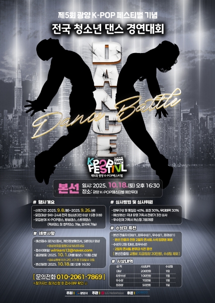 광양시, ‘전국 청소년 댄스 경연대회’ 참가자 모집 [PEDIEN] 광양시가 제5회 광양 K-POP 페스티벌을 기념해, 대한민국의 미래를 이끌어갈 청소년들에게 꿈과 열정의 무대를 제공할 ‘전국 청소년 댄스 경연대회’의 참가자를 모집한다. 전국 청소년 댄스 경연대회 본선은 10월 18일 광양 K-POP 페스티벌 특설무대에서 열린다. 예선은 동영상 심사로 진행돼 지역에 상관없이 누구나 쉽게 참여할 수 있다. 참가 대상은 9세 이상 24세 이하 청소년이며 팀은 3명 이상 12명 이하로 구성해야 한다. 모집 분야는 K-POP 댄스, 방송댄스, 스트릿댄스 3개 부문이다. 참가를 희망하는 청소년 댄스팀은 오는 9월 26일까지 5분 이내 영상을 참가신청서 개인정보동의서 등과 함께 이메일로 제출하면 된다. 예선 결과는 10월 1일까지 개별 통보되며 본선 진출팀 10개 팀에는 K-POP 페스티벌 A석 티켓과 소정의 교통비가 제공된다. 대회 총상금은 420만원으로 대상 200만원, 최우수 100만원, 우수 70만원, 장려 50만원이 수여된다. 특히 대상과 최우수 수상팀에게는 제5회 광양 K-POP 페스티벌 식전 무대에 오를 수 있는 기회가 주어진다. 접수 및 기타 문의 사항은 광양시청 누리집 공고란을 참고하거나 주관사에 문의하면 된다. 이현주 관광과장은 “한국의 K-POP 문화를 전면에 내세운 애니메이션 ‘케이팝 데몬 헌터스’의 인기가 이어지는 가운데, 이번 대회가 K-POP의 미래를 이끌어 갈 예비 뮤지션들에게 성장의 발판이 되길 바란다”며 “많은 청소년의 관심과 참여를 기대한다”고 말했다. 한편 올해 5회째를 맞는 글로벌 관광축제 ‘광양 K-POP 페스티벌’은 오는 10월 17일과 18일 광양공설운동장 일원에서 화려한 라인업과 함께 이틀간 펼쳐질 예정이다. -