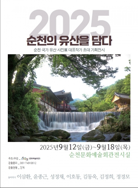 순천 국가유산 사진展, 사실의 기록과 예술 [PEDIEN] 순천시문화예술회관은 오는 12일부터 18일까지 문화예술회관 전시실에서 기획전시 ‘순천의 유산을 담다: 순천 국가유산 사진展’을 개최한다고 밝혔다. 이번 전시는 ‘2025 순천 세계유산 축전 선암사, 순천갯벌’과 같은 기간에 열려, 지역의 문화유산을 다채롭게 조명하는 뜻깊은 기회가 될 전망이다. 전시에서는 순천이 간직한 고유한 문화유산을 담은 사진 28점을 선보이며 특히 선암사 화담 승종스님의 20년 전 촬영작 ‘삼보일배’ 작품도 함께 전시된다. 참여 작가는 순천시 사진 작가협회 소속 대표 작가 7인으로 각기 다른 시선과 감각을 통해 순천의 문화유산을 생생하게 담아냈다. 전시는 순천의 국가유산은 물론 과거의 일상적 풍경과 기억을 사진으로 담아 사라져가는 삶의 흔적과 의미를 시각적으로 전달하고 지역 내 국가유산에 대한 시민들의 관심과 자긍심을 고취하는 데 의의를 두고 있다. 13일부터 14일까지는 체험부스가 운영되어 전시장을 찾은 관람객들이 직접 사진을 촬영하고 인화하는 특별한 경험을 할 수 있다. 또한 순천시문화예술회관 홈페이지 내 온라인 전시관에서도 주요 작품들을 감상할 수 있어 현장을 찾기 어려운 시민들도 전시를 즐길 수 있다. -