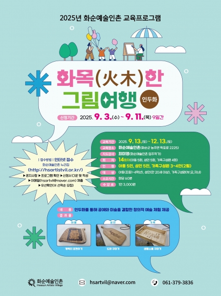 화목한 그림 여행, 인두화로 여는 창의 체험 [PEDIEN] 화순군은 3일 지역민의 문화예술 체험 기회를 넓히고 생활 속에서 즐길 수 있는 공예 문화를 확산하기 위해 화순예술인촌에서 입주작가와 함께하는 인두화 체험 프로그램 ‘화목한 그림 여행’을 운영한다고 밝혔다. 이번 프로그램은 나무를 태워 무늬를 새기는 독특한 창작 기법인 인두화를 활용해 공예와 미술을 융합한 새로운 예술 체험을 제공하고자 기획됐으며 이를 통해 아동·성인·가족이 참여해 인두화 기법을 직접 체험하고 참가자에게 작품을 완성할 기회가 주어진다. 프로그램은 2025년 9월 13일부터 12월 13일까지 총 14회로 화순예술인촌 입주작가 작업실에서 아동반, 성인반, 가족반 3개 과정으로 운영할 예정이다. 아동반과 성인반은 차시별 최대 5명을 모집해 각각 5회차 수업을 진행한다. 가족반은 1팀 기준으로 차시별 2팀을 모집해 총 4회차를 진행한다. 모든 수업은 회차별 1시간씩 진행되며 수강료는 1인당 3,000원이다. 참여자들은 인두화를 활용해 캐릭터 표현, 생활 소품 꾸미기 등 다양한 작품을 완성한다. 이번 프로그램을 통해 참여자들은 일상에서 쉽게 접하기 어려운 공예 기법을 체험하고 창작의 즐거움을 느낄 수 있으며 세대 간 교류와 가족 단위 참여가 가능해 지역사회 내 예술적 소통의 장이 될 것으로 기대된다. 프로그램을 기획한 담당자는 “인두화는 나무와 열이 만나 만들어내는 독특한 표현 방식이다. 이번 체험을 통해 아이들부터 성인, 가족까지 모두가 자신만의 작품으로 즐거운 체험이 되길 바란다”고 말했다. 수강 신청 기간은 9월 3일부터 9월 11일까지이며 프로그램 참여 대상에 해당하는 사람은 누구나 신청할 수 있다. 신청서는 화순예술인촌 누리집 공지 사항에서 내려받아 작성한 뒤, 기간 내 이메일로 제출하고 반드시 유선 확인을 해야 한다. 자세한 내용은 화순예술인촌 누리집에서 확인할 수 있으며 문의 사항은 화순예술인촌으로 하면 된다, 매주 일요일과 월요일은 휴관이다. -