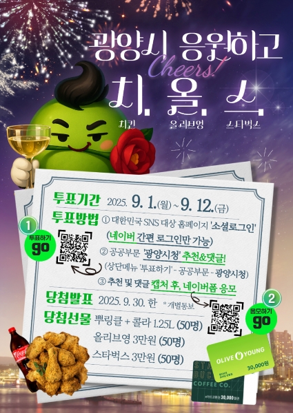 광양시, ‘대한민국 SNS 대상’ 투표 참여 독려 이벤트 추진 [PEDIEN] 광양시는 ‘제15회 2025 대한민국 SNS 대상’ 대국민 투표 참여를 독려하기 위해 온·오프라인 이벤트를 추진한다고 밝혔다. ‘대한민국 SNS 대상’은 과학기술정보통신부가 후원하고 한국소셜콘텐츠진흥협회가 주최하는 국내 최고 권위의 SNS 분야 시상이다. 주최 측은 2011년부터 매년 객관적인 평가를 통해 국민과 활발히 소통하는 기업과 공공기관을 선정해 상을 수여하고 있다. 올해 투표 기간은 9월 1일부터 12일까지이며 시는 누구나 쉽게 참여할 수 있는 온라인 이벤트 ‘광양시 응원하고 치. 올. 스.’로 참여율을 높일 계획이다. 온라인 이벤트 참여 희망자는 홈페이지에 접속해 네이버 간편 로그인 후, 공공부문 ‘광양시청’ 페이지에 들어가 추천 버튼을 눌러 투표하고 응원 댓글을 남긴 뒤, 해당 화면을 캡처해 네이버폼에 제출하면 된다. 응모를 완료한 참여자 중 추첨을 통해 총 150명에게 경품이 제공된다. 경품은 △뿌링클 치킨+콜라 1.25L 세트 △올리브영 3만원 쿠폰 △스타벅스 3만원 쿠폰 등이다. 오프라인 행사도 진행된다. 시는 오는 9월 3일 용강도서관, 8일 중마도서관, 10일 금호청소년문화의 집 등 주요 권역 시설을 방문할 예정이며 현장에서 투표에 참여한 시민들에게 매돌이 파우치 등 굿즈를 증정하는 투표 독려 캠페인을 진행할 계획이다. 광양시는 이번 홍보를 통해 광양시 공식 SNS 채널이 널리 알려지고 많은 시민들이 소통에 참여할 수 있기를 기대하고 있다. 광양시 관계자는 “이벤트 참여 시 광양시 SNS 채널을 구독해 주시길 바란다. 이를 통해 시의 정책, 문화, 관광 등 다양한 소식을 가까이 접하실 수 있을 것”이라고 강조했다. 이어 “광양시가 SNS 분야에서 꾸준히 좋은 평가를 받아온 것은 시민들의 활발한 참여와 응원 덕분”이라며 “앞으로도 시민과 함께하는 열린 소통 행정을 통해 대한민국을 대표하는 SNS 선도 도시로 더욱 발전해 나가겠다”고 덧붙였다. 광양시는 다양한 채널을 통한 시민 소통 노력을 인정받아 2017년부터 2024년까지 8년 연속 SNS 분야에서 우수한 성적을 거두었으며 지난해에는 ‘대한민국 SNS 대상’ 기초지자체 시 부문 최우수상과 ‘올해의 SNS’ 인스타그램 부문 최우수상을 수상하며 SNS 활용 선도 지자체로 자리매김했다. -