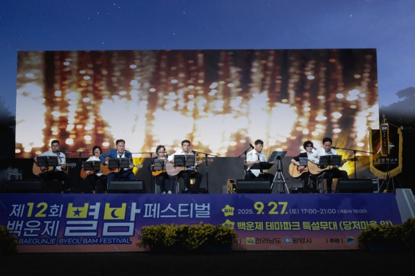 광양시, 제12회 백운제 별밤 페스티벌 성황리 마무리 [PEDIEN] 광양시는 가을밤의 정취와 함께한 ‘제12회 백운제 별밤 페스티벌’ 이 9월 27일 봉강면 백운제 테마파크 특설무대에서 성황리에 마무리됐다고 밝혔다. 이번 행사는 봉강면청년회가 주관했으며 지역 주민과 관광객 등 800여명이 참석해 축제 분위기를 함께 즐겼다. 오후 4시부터는 천체관측, 별모양 방향제 만들기, LED 풍선 만들기, 페이스페인팅, 네일아트, 풍선아트, 캘리그라피 등 다채로운 체험 부스가 운영돼 가족 단위 방문객들에게 큰 인기를 끌었다. 축제는 봉강초등학교 학생들의 사물놀이 공연으로 막을 올렸다. 이어 주민자치프로그램인 라인댄스·난타, 비봉풍물단의 풍물놀이 공연으로 본격적인 별밤 콘서트가 이어졌다. 시립합창단의 감미로운 합창은 무대를 수놓았고 초대가수 홍진영의 무대에서는 관객들의 뜨거운 함성과 함께 분위기가 절정에 달했다. 특히 기타 연주 공연은 별빛이 내리는 가을밤과 어우러져 깊은 감동을 선사했다. 어쿠스틱 기타의 맑고 따뜻한 선율이 백운제의 고요한 자연 풍경과 어우러지며 관객들에게 잊지 못할 낭만적인 순간을 선물했다. 정종호 봉강면청년회장은 “별빛 아래 모인 모든 이들의 열정과 참여 덕분에 뜻깊은 행사가 됐다”며 “앞으로도 지역 주민이 함께 만들어가는 문화 축제로 발전시켜 나가겠다”고 소감을 밝혔다. 김명순 봉강면장은 “백운제 별밤 페스티벌은 지역 주민들의 자발적인 참여와 열정이 만들어낸 아름다운 축제”며 “앞으로도 봉강면이 문화와 자연이 어우러진 힐링의 공간으로 더욱 성장할 수 있도록 함께 노력하겠다”고 말했다. 한편 백운제 별밤 페스티벌은 지역문화 활성화와 공동체 의식 함양을 목적으로 매년 개최되는 봉강면의 대표 문화행사다. 과거 ‘산사음악회’로 시작해 해를 거듭할수록 규모와 프로그램이 다양해지고 있다.