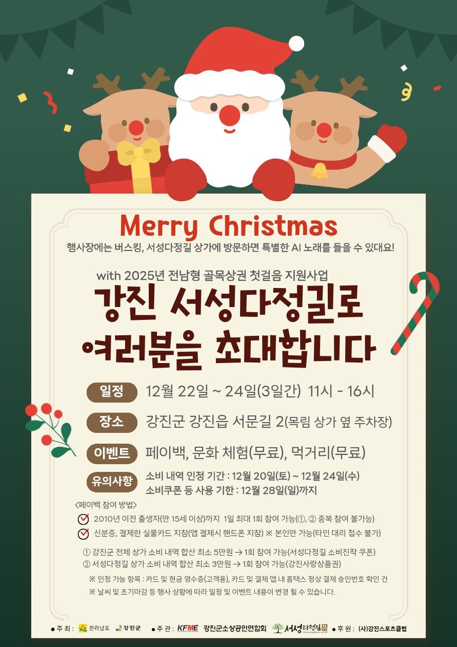 담양군문화재단, 2025 크리스마스 특별 공연으로 원도심 밝힌다 - 12월 24일 ~ 12월 25일 중앙공원 일원에서 거리공연 개최 (담양군 제공) [PEDIEN] 담양군이 크리스마스를 맞아 특별한 문화 행사를 개최한다. 담양군문화재단은 오는 12월 24일부터 25일까지 담양읍 중앙공원 일원에서 '2025 크리스마스 특별 공연'을 펼친다고 밝혔다.이번 공연은 '제7회 담양산타축제'와 연계하여 진행되며, 군민과 관광객들에게 풍성한 문화 향유 기회를 제공하기 위해 마련됐다. 재단은 거리 공연을 통해 원도심 유동 인구를 증대시켜 지역 상권 활성화에 기여한다는 목표다.공연은 양일 모두 오후 2시부터 5시까지 진행된다. 24일에는 포크 가수 정용주, 공성길, 주현 등이 출연하여 감미로운 음악을 선사하고, 전남도립대 버스킹팀과 여신콜라보예술단이 크리스마스이브의 분위기를 한층 고조시킬 예정이다.크리스마스 당일인 25일에는 현악 연주자 김수연을 비롯해 트로트 가수 한소아, 농민가수 박인성, 백파이프 연주자 김중식, 인디밴드 코너 등 다양한 장르의 공연이 펼쳐진다. 관람객들은 풍성하고 다채로운 무대를 즐길 수 있다.공연 기간 동안 재단은 누리소통망 팔로우, 메신저 친구 추가 등 간단한 참여 프로그램과 함께 군고구마, 가래떡 체험 행사도 운영한다. 가족 단위 방문객들에게 특별한 즐거움을 선사할 것으로 기대된다.재단 관계자는 “이번 공연을 통해 지역 예술인들에게 더 많은 무대 기회를 제공하고, 군민들이 함께 즐거운 연말을 보낼 수 있도록 최선을 다해 준비하고 있다”며 “크리스마스 시즌에 담양 원도심에서 열리는 이번 공연에 많은 관심과 참여를 바란다”고 전했다.한편, 담양군문화재단은 행사 기간 동안 안전 관리와 관람객 편의를 위해 최선을 다할 계획이다.