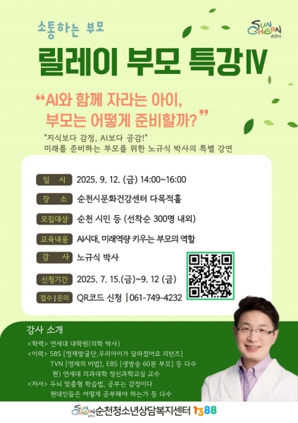 순천시, ‘AI시대, 자녀의 두뇌교육법’ 부모특강 개최 [PEDIEN] 순천시는 오는 9월 12일 오후 2시, 순천시문화건강센터 다목적홀에서 순천시민을 대상으로 노규식 박사 초청 부모 특강을 개최한다고 밝혔다. 이번 특강은 2025 릴레이 부모 특강의 마지막 강연으로 급변하는 디지털 환경 속에서 자녀를 양육하는 부모들에게 올바른 교육 방향과 소통 방법을 제시하기 위해 마련됐다. 강연을 맡은 노규식 박사는 뇌과학 및 아동·청소년 심리 전문가로 최근 ‘AI 시대의 교육 변화와 부모의 대응 전략’을 주제로 활발한 강연과 저술 활동을 이어가고 있다. 특강에서는 △AI시대 자녀의 학습 및 진로 환경 변화 △창의성과 정서 역량 강화 방법 △디지털 시대의 소통 전략 등을 다룰 예정이며 특히 미래 핵심 역량을 키우기 위한 부모의 구체적 지원 방법도 제시한다. 참가 신청은 순천시민 누구나 무료로 가능하며 네이버폼또는 QR코드 스캔을 통해 접수할 수 있다. 시 관계자는 “AI 시대에는 부모의 교육법이 달라져야 한다”며 “이번 특강이 자녀의 잠재력을 키우고 부모와 자녀가 함께 성장하는 계기가 되길 바란다”고 전했다.