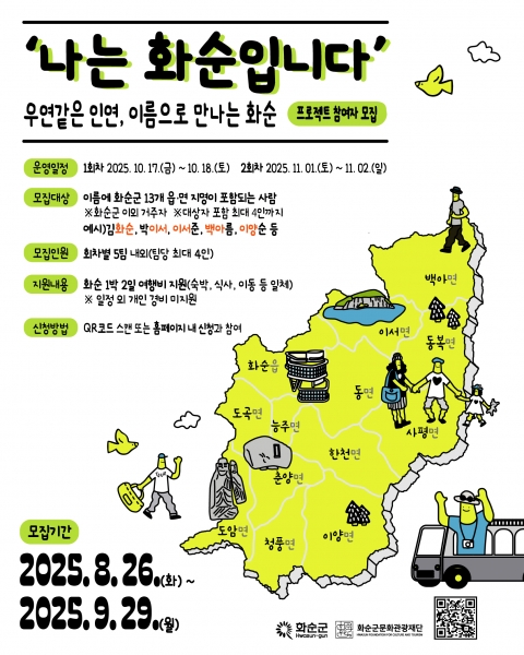 이름 속 화순, 마음속 화순을 찾아서 … ‘나는 화순이다’ 프로젝트 참여자 모집 [PEDIEN] 화순군문화관광재단은 26일 화순군의 지명과 특별한 인연을 가진 사람들에게 화순 1박 2일 여행을 지원하는 ‘나는 화순이다’ 프로젝트 참여자를 모집한다고 밝혔다. 이번 프로젝트는 화순군 관외에 거주하며 화순읍, 능주면, 동복면, 도곡면, 동면, 이서면, 한천면, 백아면, 춘양면, 도암면, 청풍면, 사평면, 이양면 등 이름 속에 화순군 13개 읍·면 지명이 포함되는 사람을 대상으로 해, 2025년 8월 26일부터 9월 29일까지 참여자를 모집한다. 신청자는 본인을 포함해 최대 4인까지 동반 참여할 수 있으며 선정된 참가자들에게는 식사, 숙박, 이동 등이 지원된다. 이번 여행은 단순한 관광을 넘어, 화순의 역사와 문화, 자연의 아름다움을 오롯이 체험하는 기회가 될 예정이다. 프로그램 일정에는 1회차에 화순 고인돌 가을꽃 축제장, 2회차에 화순 운주문화축제장 방문이 포함되어 있다. 고인돌 유적지의 가을꽃은 화순만의 계절미를 느낄 수 있는 대표적인 명소이며 운주문화축제는 화순의 사찰 운주사 일원에서 열려 다양한 공연과 체험 부스를 통해 화순의 대표 축제를 즐기고 교류하며 화순의 따뜻한 정과 문화를 직접 경험할 수 있다. 특히 이름 속에 담긴 지명을 매개로 이루어지는 이번 프로젝트는 화순이라는 지역과 참여자들 간의 특별한 유대감을 형성하는 계기가 될 전망이다. 화순군문화관광재단 대표이사 구종천은 “이름 속에 화순의 지명이 담긴 분들은 이미 특별한 인연을 가진 분들”이라며 “이번 기회를 통해 화순과 한층 더 가까워지고 잊지 못할 추억을 만들 수 있기를 기대한다”고 전했다. 모집 및 참여 신청에 대한 자세한 내용은 화순군문화관광재단 누리집의 공지 사항에서 확인할 수 있다. -
