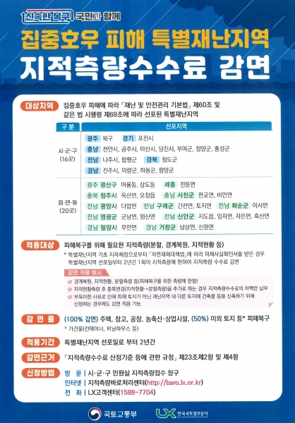광양시, 특별재난지역 지적측량 수수료 감면 시행 [PEDIEN] 광양시는 지난 8월 6일 집중호우 피해로 특별재난지역으로 지정된 다압면 주민들을 대상으로 선포일로부터 2년간 지적측량 수수료를 한시적으로 감면한다고 밝혔다. 이는 재해로 피해를 입은 주민들의 조속한 복구를 돕고 행정 지원을 강화하기 위한 조치이다. 감면율은 피해 유형에 따라 차등 적용된다. 주거용 건축물이 전파되거나 유실된 경우 지적측량 수수료 전액이 감면되며 기타 피해 복구 목적의 지적측량에는 수수료의 50%가 감면된다. 수수료 감면을 받기 위해서는 광양시 안전과에서 ‘피해 사실 확인서’를 발급받은 뒤, 해당 서류의 발급일로부터 3개월 이내에 지적측량을 신청하면서 해당 서류를 제출하면 된다. 감면은 피해 복구를 위한 지적측량 1회에 한해 적용된다. 측량신청은 광양시청 민원지적과 내 측량접수창구를 직접 방문하거나, 지적측량바로처리센터 누리집 또는 바로처리콜센터를 통해 할 수 있다. 김희선 광양시 민원지적과장은 “이번 지적측량 수수료 감면이 집중호우로 큰 피해를 입은 주민들의 경제적 부담을 덜고 하루빨리 일상을 회복하는 데 실질적인 도움이 되길 바란다”고 말했다. -