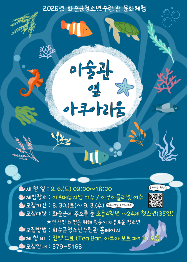 화순군청소년수련관, 문화체험 ‘미술관 옆 아쿠아리움’ 참가자 모집 [PEDIEN] 화순군청소년수련관은 26일 청소년들이 문화예술과 해양 생태계를 동시에 체험할 수 있는 특별 프로그램 ‘미술관 옆 아쿠아리움’ 참가자를 모집한다고 밝혔다. 이번 체험은 9월 6일 여수 아르떼뮤지엄과 아쿠아플라넷에서 진행되며 청소년 35명을 선착순으로 선발한다. 참가 청소년들은 첨단 미디어아트 전시와 디지털 아트의 빛과 색채가 어우러진 다채로운 전시 감상은 물론, 아쿠아 보트 체험, 해양 생물 먹이 주기 및 터치 체험, 싱크로나이즈 공연 등 풍성한 해양 체험을 통해 자연과 예술의 융합을 직접 느끼는 뜻깊은 하루를 경험하게 된다. 화순군에 주소를 둔 초등학교 4학년 이상부터 24세 이하 청소년이면 누구나 참여할 수 있다. 신청 기간은 8월 30일부터 9월 3일까지이며 화순군청소년수련관 홈페이지 프로그램 신청 게시판을 통해 접수가 가능하다. 안전한 활동을 위해 자유로운 체험이 가능한 초등학교 4학년부터 모집 대상에 포함했다. 이는 참가자들의 체험 만족도와 안전을 동시에 고려한 조치다. 최종 확정자는 개별 문자로 안내될 예정이다. 서봉섭 화순군 가족정책실장은 “이번 체험은 청소년들이 예술적 감수성과 자연의 소중함을 함께 경험하는 소중한 기회가 될 것이다”며 “앞으로도 청소년수련관은 청소년들의 성장을 돕는 다채로운 프로그램을 지속적으로 운영해 나가겠다”고 말했다. -