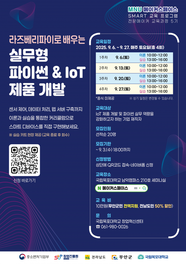 무안 MNU메이커스페이스, 실무 맞춤형 교육생 모집 [PEDIEN] 전남 무안군은 국립목포대학교 창업혁신센터 MNU메이커스페이스에서 9월 27일까지 ‘라즈베리파이로 배우는 실무형 파이썬&IoT’를 운영한다고 밝혔다. 이번 교육은 기업재직자를 대상으로 프로그래밍 기초부터 현업에서 활용가능한 응용 실습을 통해 4차 산업혁명 시대 핵심기술 역량을 강화하는 것을 목표로 한다. 교육비는 10만원으로 무안군민에게는 교육비 전액을 지원하며 그 외 전남도민에게는 50% 할인 혜택을 제공한다. 이혜향 미래성장과장은 “지역민들이 IoT와 파이썬을 실무에 접목할 역량을 기르는 좋은 기회”며 “앞으로도 미래 산업에 발맞춰 나갈 수 있도록 맞춤형 교육을 제공하겠다”고 밝혔다. -